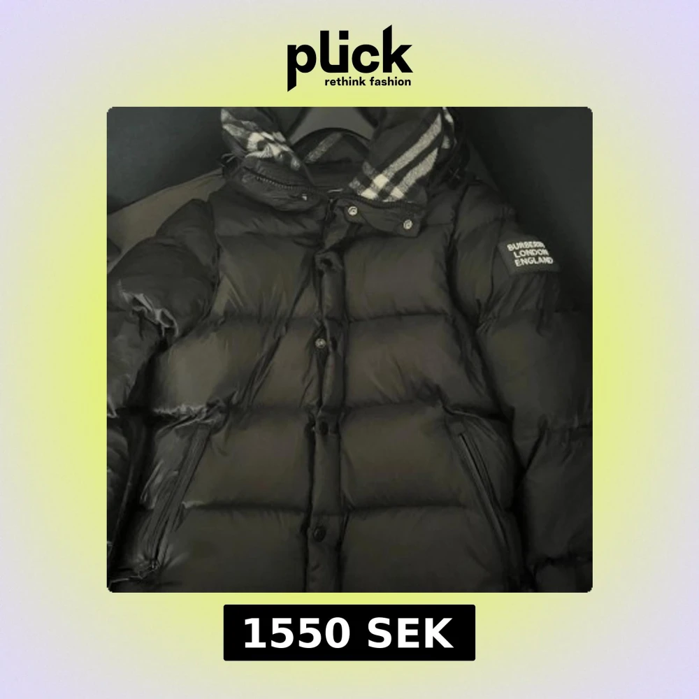 Säljer en svart dunjacka från Burberry med klassiskt rutigt foder i huvan. Jackan har dragkedja och knappar framtill, två sidofickor med dragkedja och en patch med Burberry London England på ärmen. Perfekt för kalla dagar och riktigt snygg streetstil.