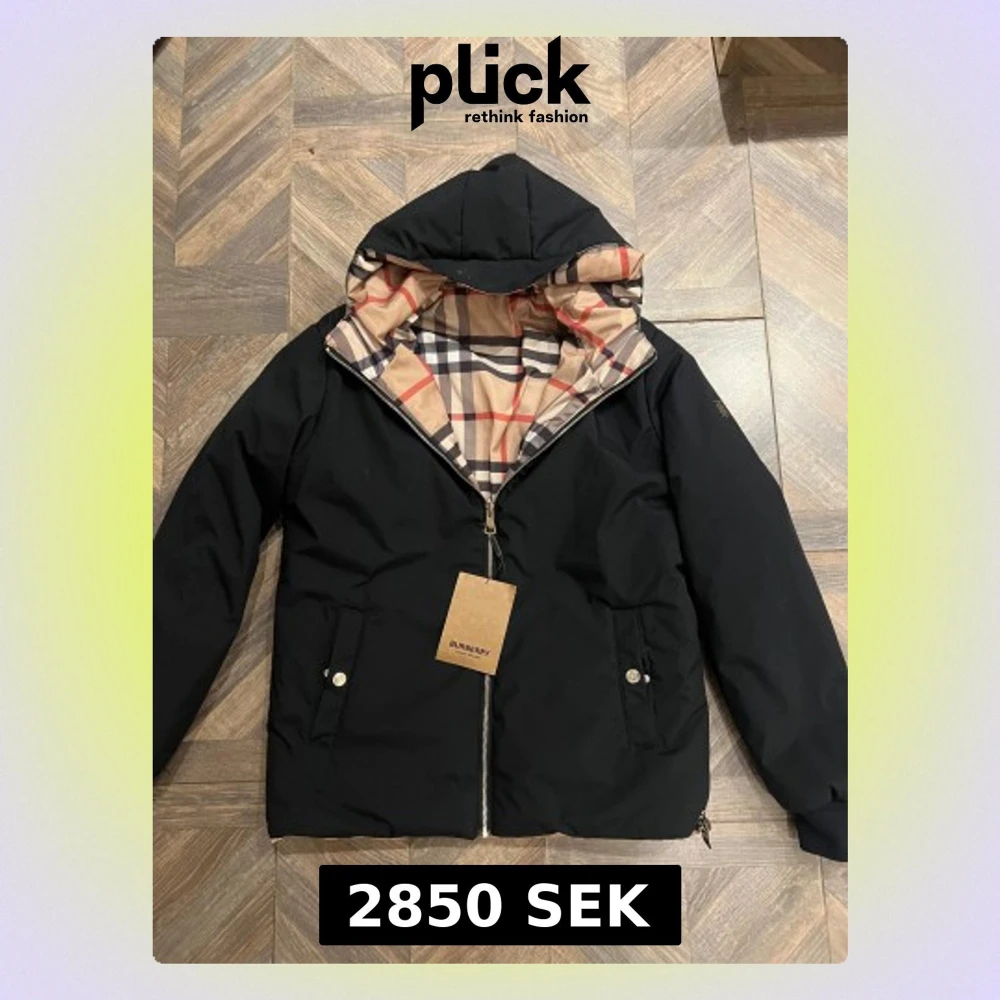 Snygg vändbar pufferjacka från Burberry med klassiskt rutigt mönster på ena sidan och svart på andra. Jackan har huva, dragkedja, fickor med tryckknappar och metallogo på ärmen. Perfekt för dig som vill ha både stil och funktion.