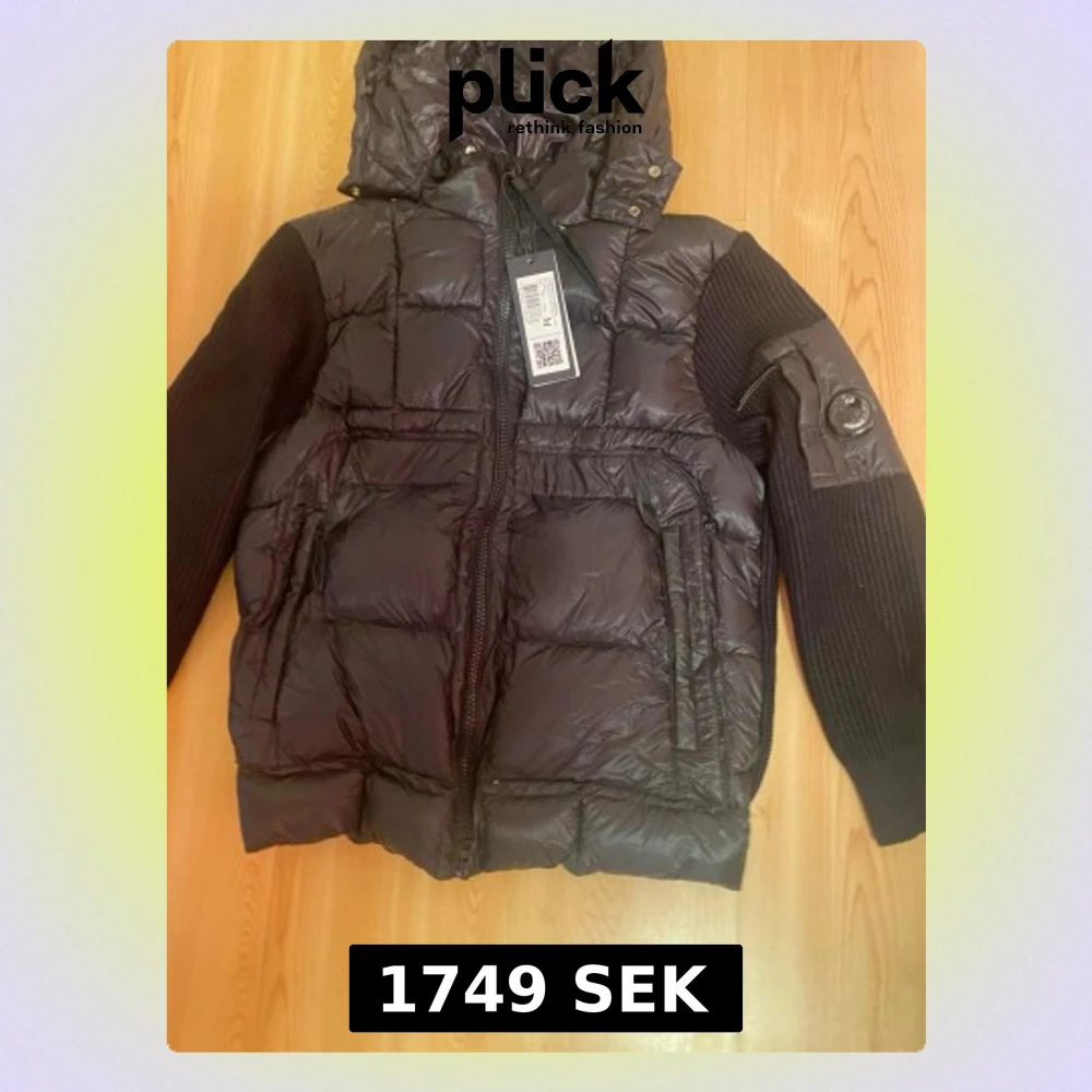 Säljer en svart dunjacka från C.P. Company med huva och stickade ärmar. Jackan har quiltad front, dragkedja och en cool detalj med logga på ärmen. Perfekt för dig som vill ha en snygg och varm jacka med streetkänsla. Storlek M passar S