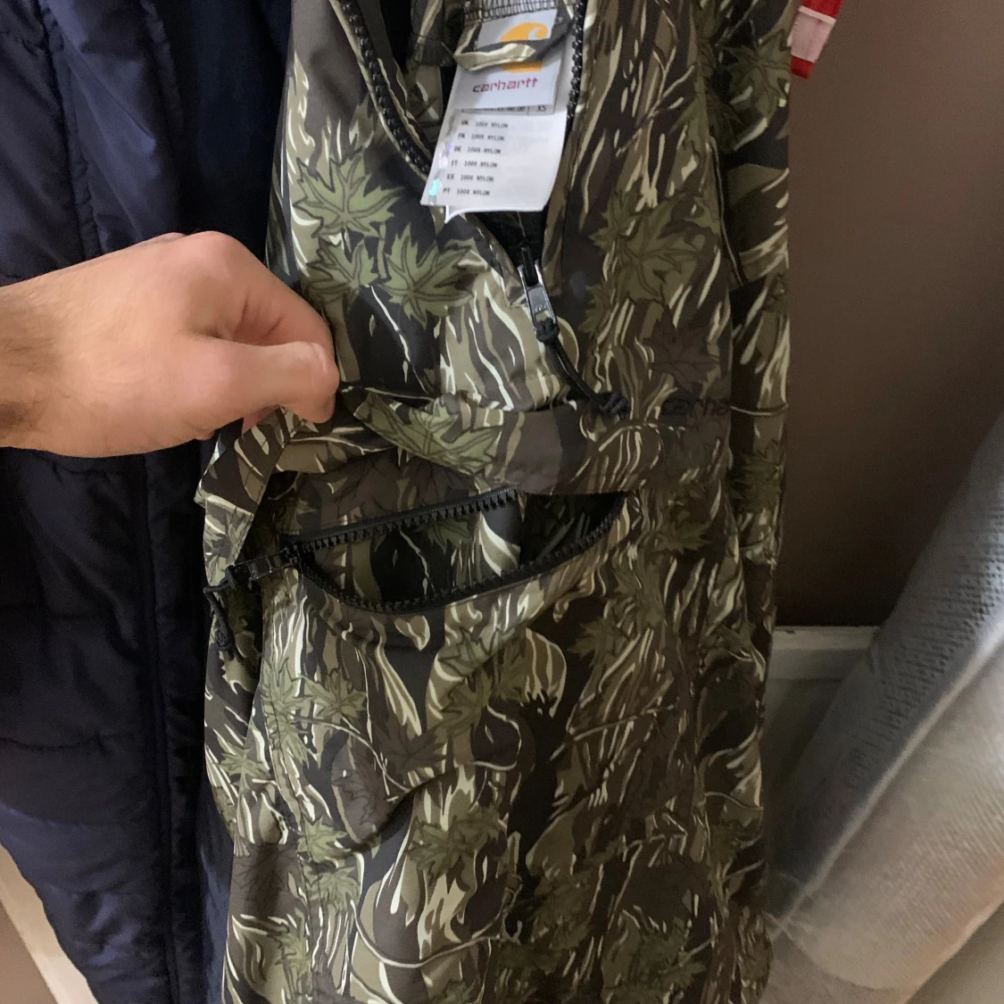 Säljer en grön och brun camouflage vindjacka från Carhartt. Jackan är tillverkad i 100% nylon, har dragkedja framtill och praktiska fickor. Perfekt för dig som vill ha en streetig och funktionell look med snyggt mönster.