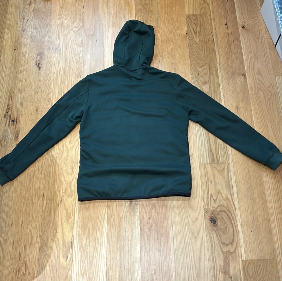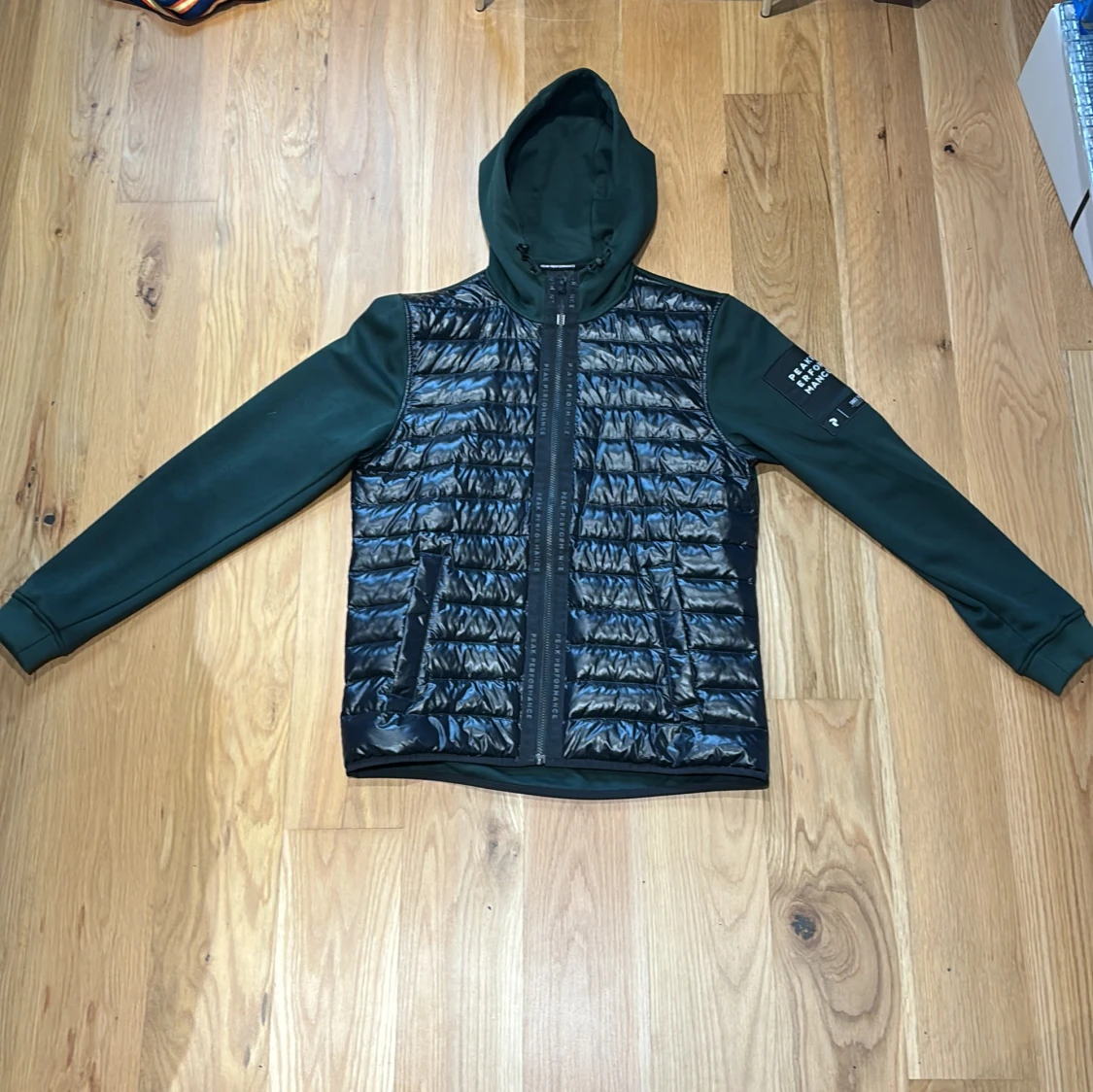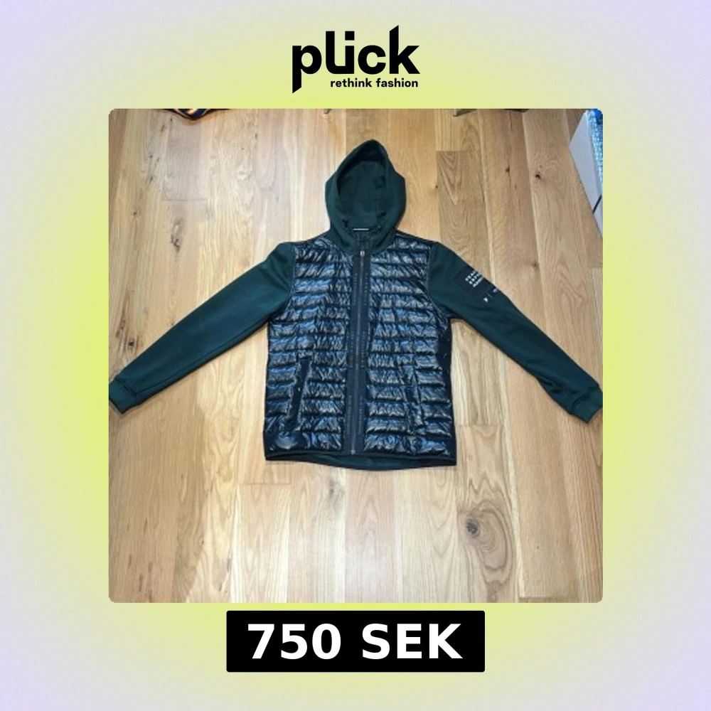 Snygg hybrid från Peak Performancemed glansig svart pufferfront och mörkgröna ärmar och rygg. Storlek L men passar till M. Köpt för 1800+ men säljer för 750