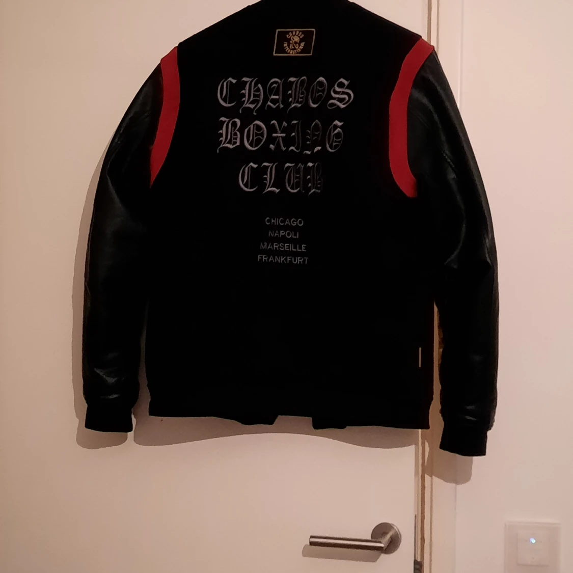 Röd,svart collagejacka mend skinn