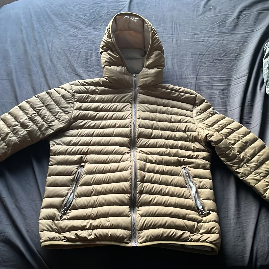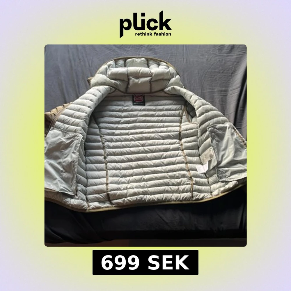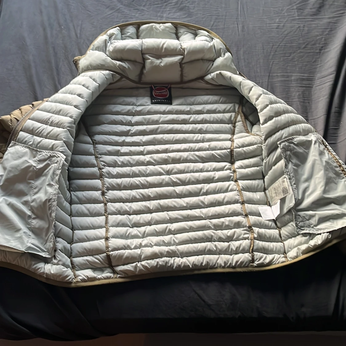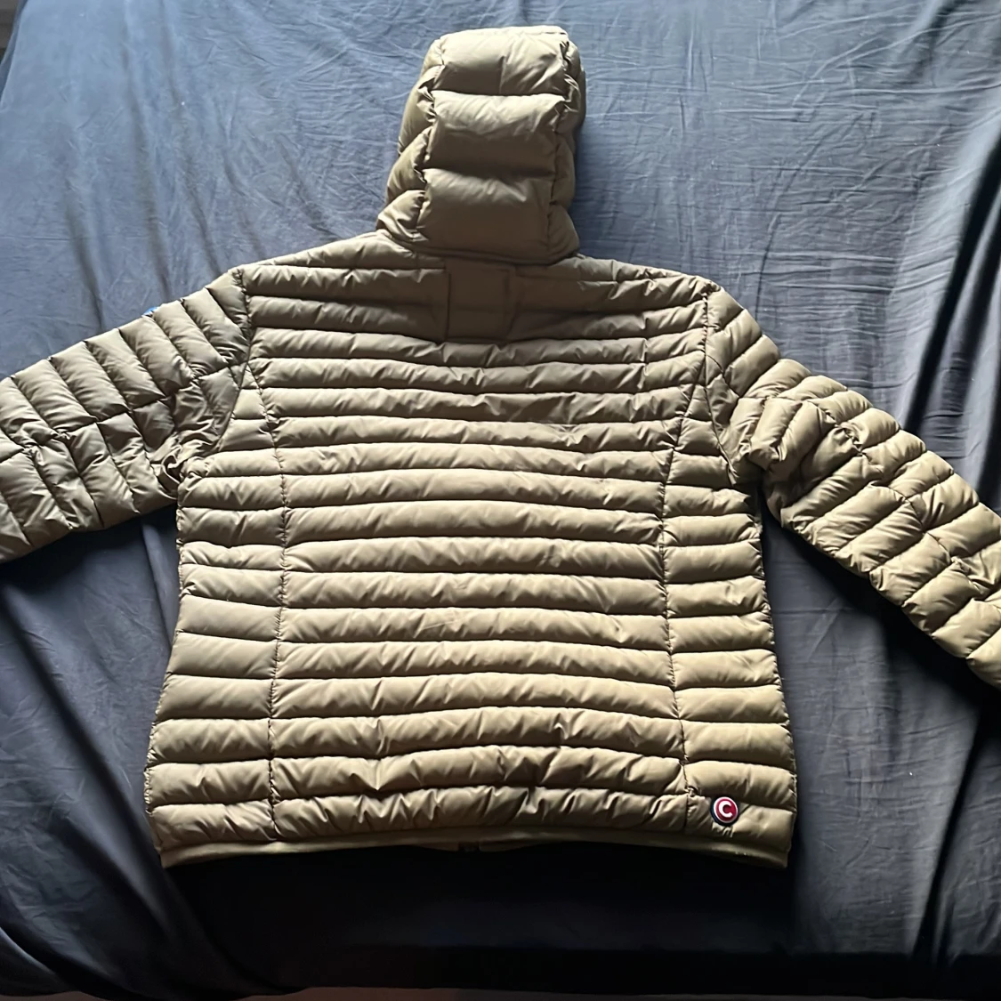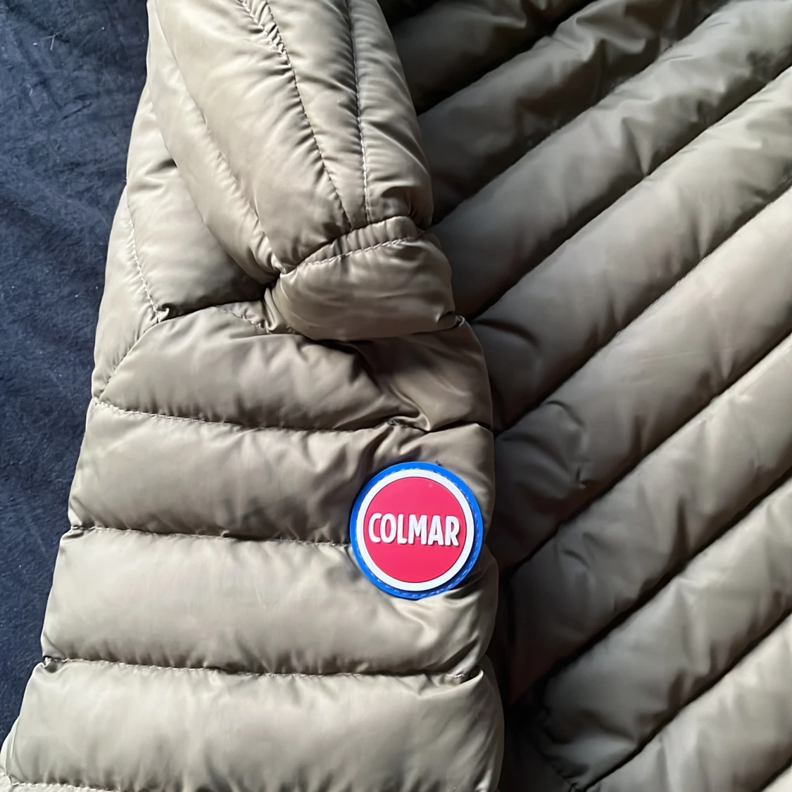 Säljer en dunjacka från Colmar med huva och horisontella sömmar. Jackan har dragkedja framtill, två fickor med dragkedja och en klassisk Colmar-logga på ärmen. Perfekt för kyliga dagar och riktigt skön att bära.