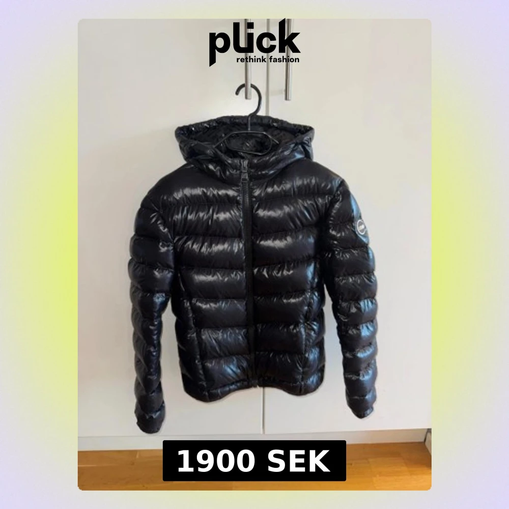 Säljer en svart, glansig pufferjacka från Colmar med huva och dragkedja framtill. Jackan har Colmar-logga på ärmen och är vadderad för extra värme. Perfekt för kalla dagar och har en riktigt snygg streetstil.