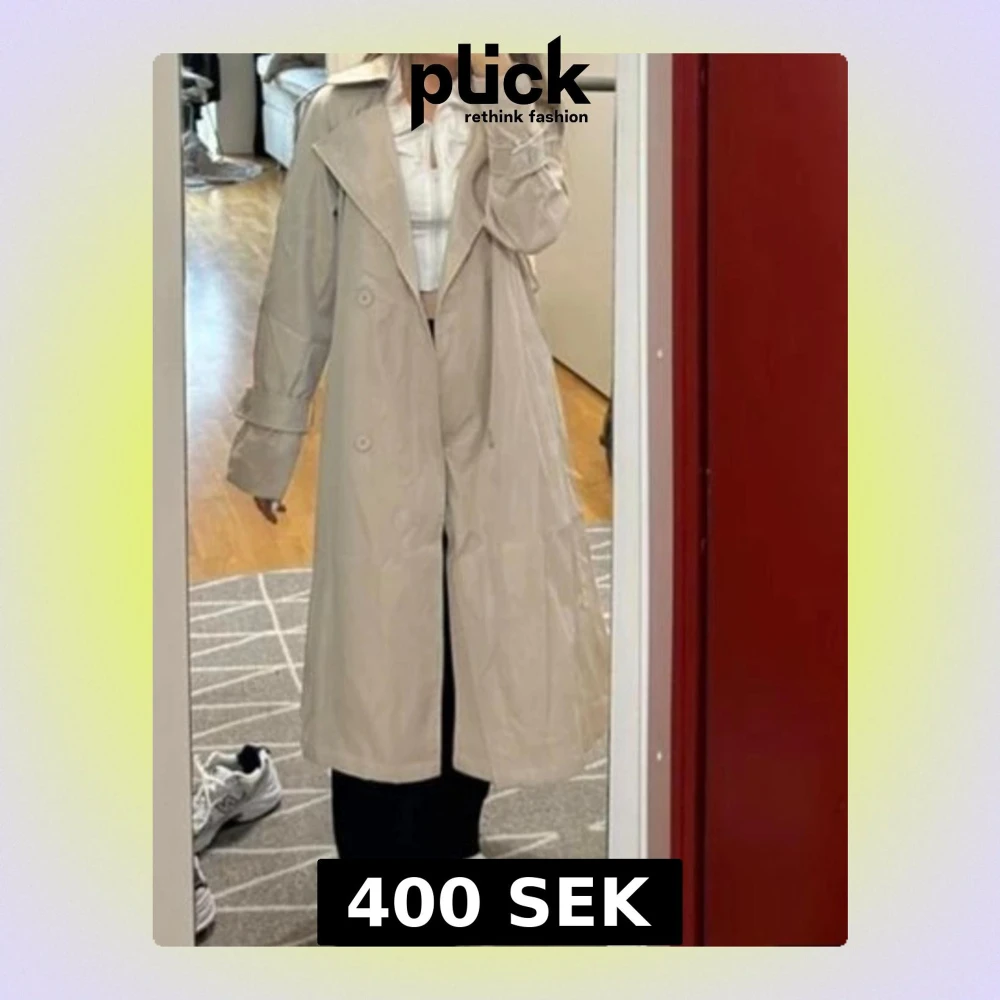 Snygg beige trenchcoat med klassisk krage och breda slag. Jackan har långa ärmar med dekorativa remmar vid handlederna och knyts med bälte i midjan. Dubbelknäppt framtill och rak, loose passform som ger en chill vibe. Perfekt för dig som vill ha en stilren och tidlös look.