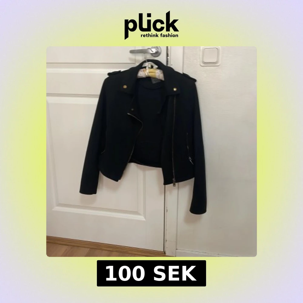 Säljer en stilren svart jacka från Primark med dragkedja och axelklaffar. Jackan har en klassisk design med långa ärmar och är perfekt för både höst och vår.