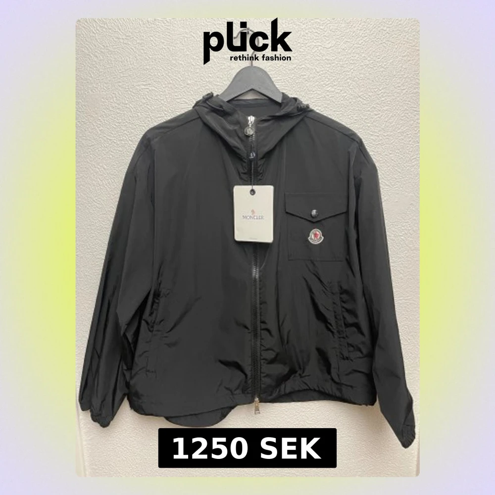 Svart vindjacka från Moncler med huva, dragkedja framtill och en bröstficka med knapp och broderad logotyp. Jackan har en patch med Moncler-logga på ärmen och justerbar dragsko i huvan. Tillverkad i lätt polyester, perfekt för blåsiga dagar.