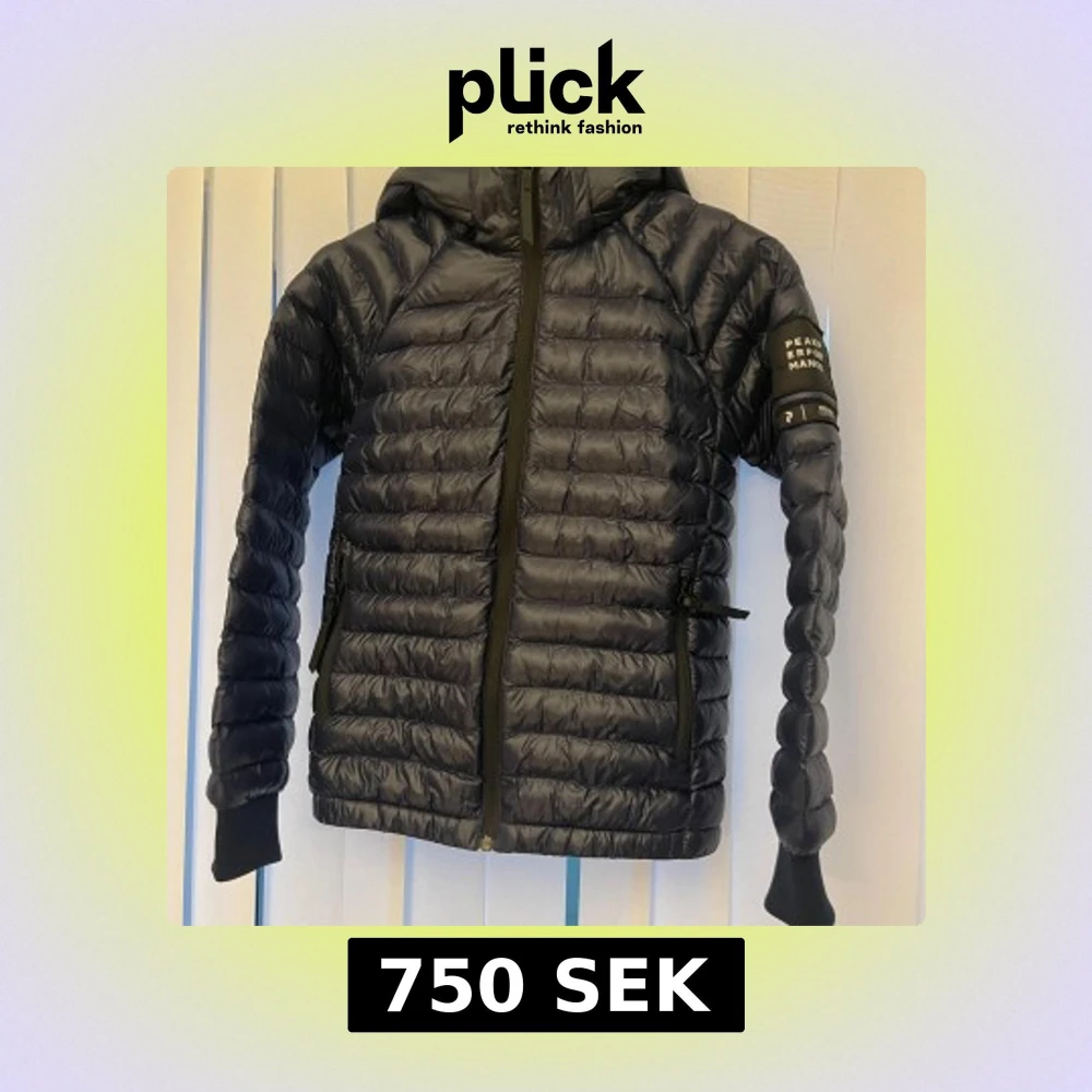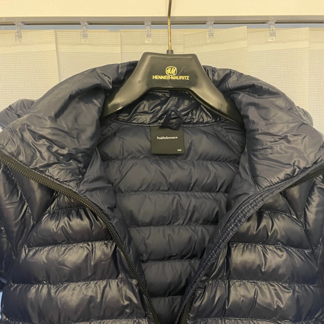 Snygg mörkblå dunjacka från Peak Performance med huva och ribbade muddar. Lättviktsdun. Jackan har quiltad design, dragkedja framtill och två fickor med dragkedja. Tyget är glansigt. Mycket fint skick, som ny. Sparsamt använd av 1 person.