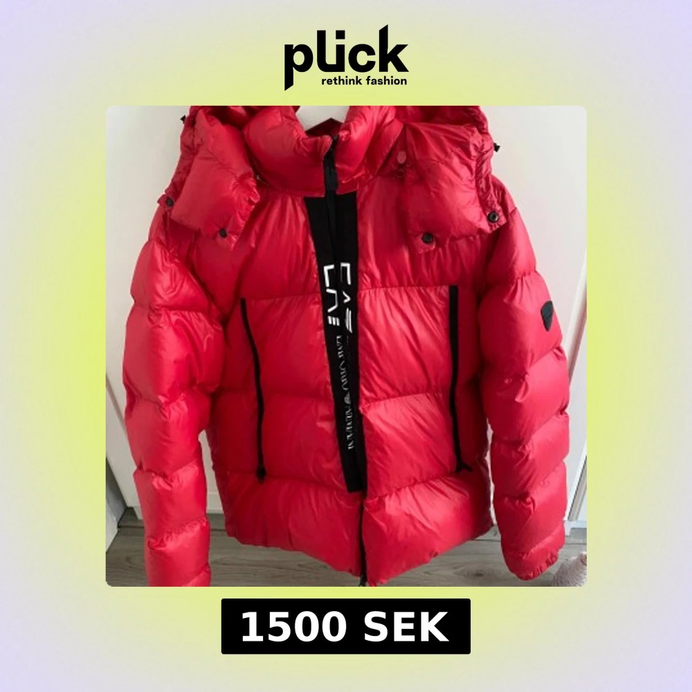 Snygg röd pufferjacka från Emporio Armani EA7 med svart logga på ärmen och coola svarta detaljer vid dragkedjan. Jackan har hög krage, huva och är riktigt fluffig. Perfekt för kalla dagar när du vill sticka ut med stil. Helt ny skick!
