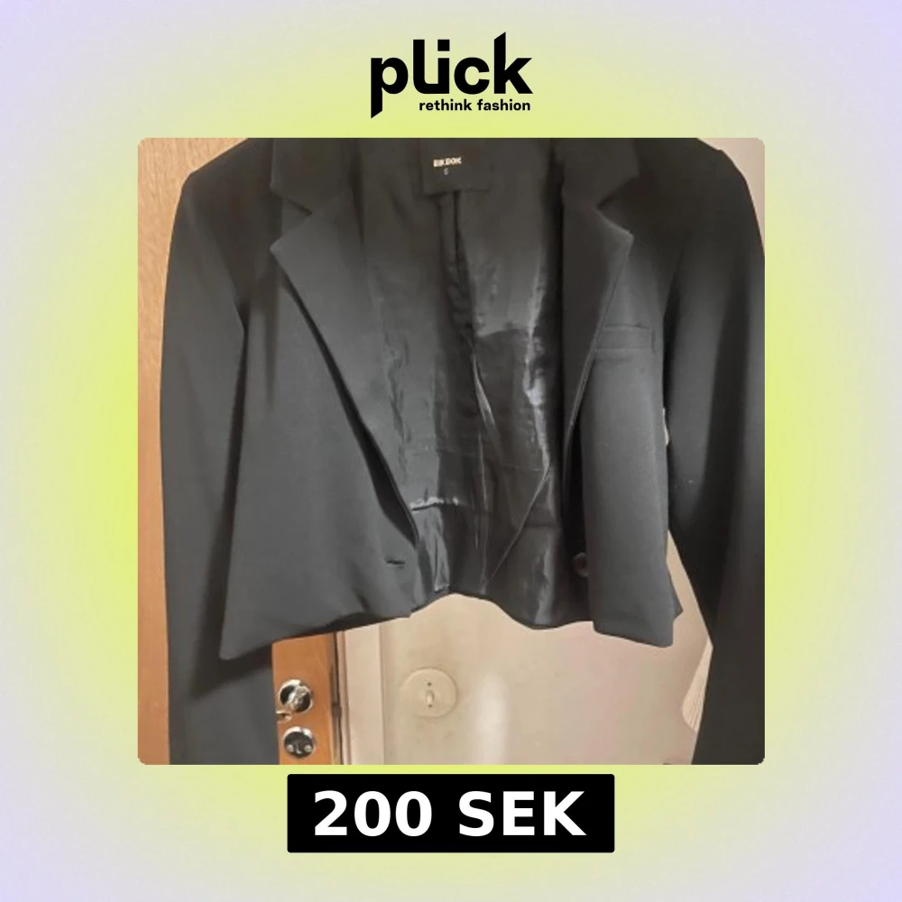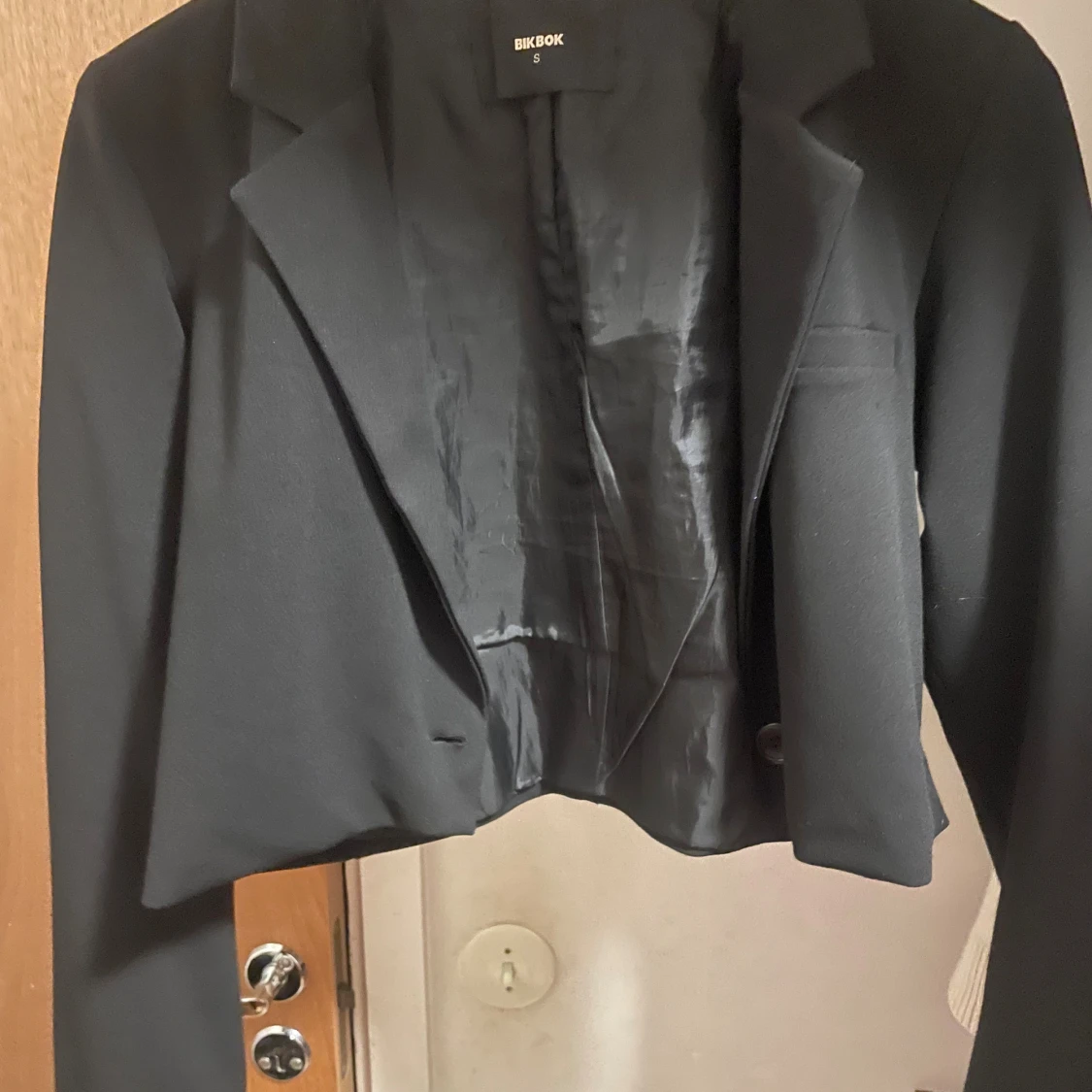 Snygg svart croppad kavaj från Bik Bok med klassisk krage och knapp framtill. Jackan har lång ärm och är fodrad på insidan för extra komfort. Perfekt för dig som vill ha en trendig och stilren look.