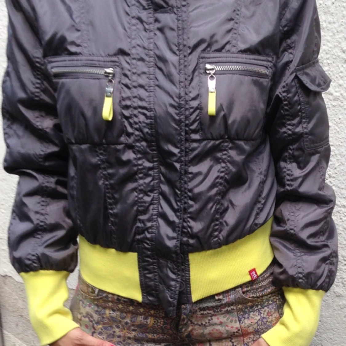 Grå mönstrig jacka från Zara - Grå jacka från Zara med vågigt mönster, två stora fickor framtill och hög krage. Jackan har en avslappnad passform och stängs med dragkedja. Perfekt för lager på lager under höst och vår.