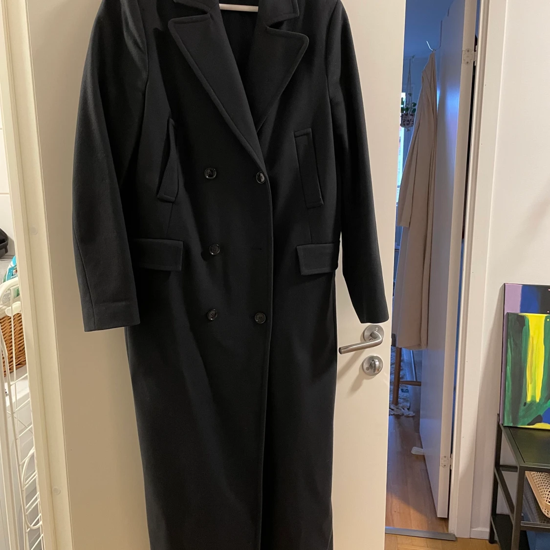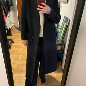 Storlek 38, lång kappa i ull och polyamid. Mitten knappen saknas, samt så har fickan börjat gå upp lite.