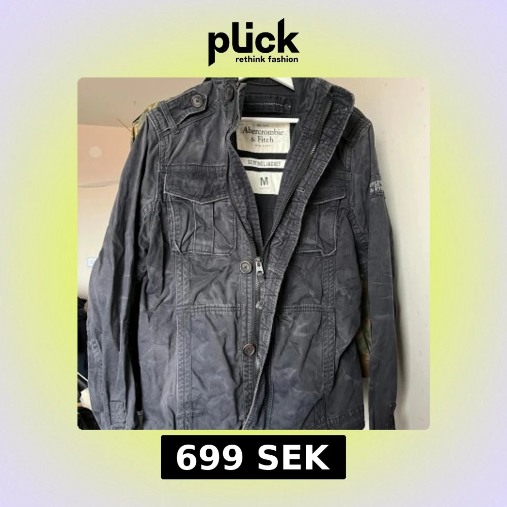 Säljer en svart vintage jacka från Abercrombie & Fitch med dragkedja och knappar. Jackan har flera fickor och en broderad logga på ärmen.