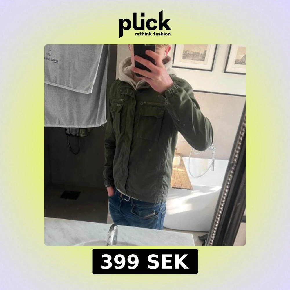 Säljer en snygg grön field jacket med dragkedja och knappar. Jackan har flera praktiska fickor och en hög krage. Perfekt för vår och höst! Väldigt sällsynt snygg jacka med hög kvalité. Väldigt true-to-size, men passar även M. Pm vid eventuella frågor