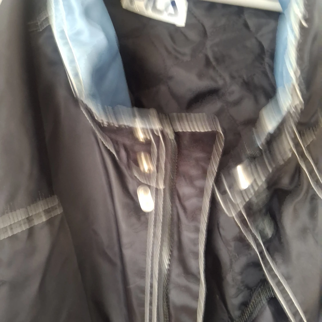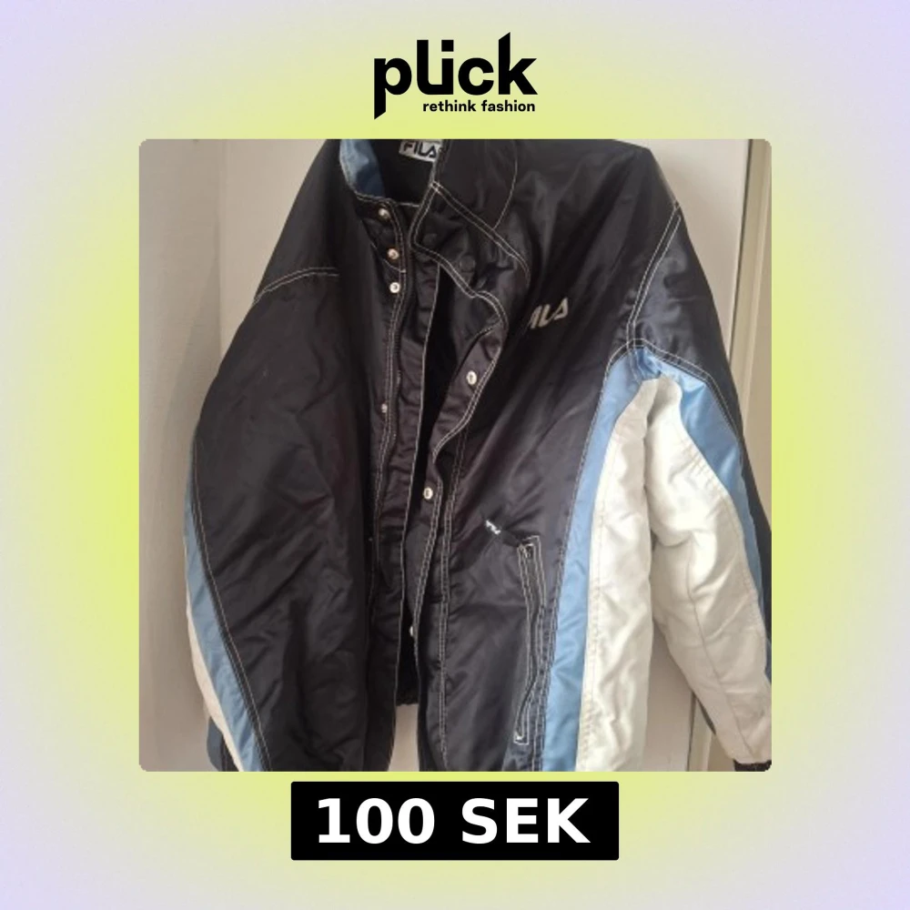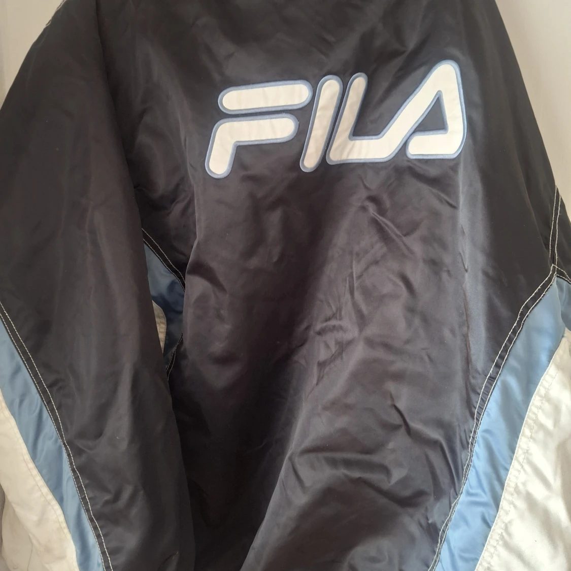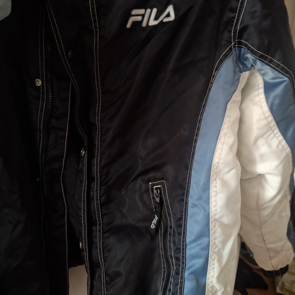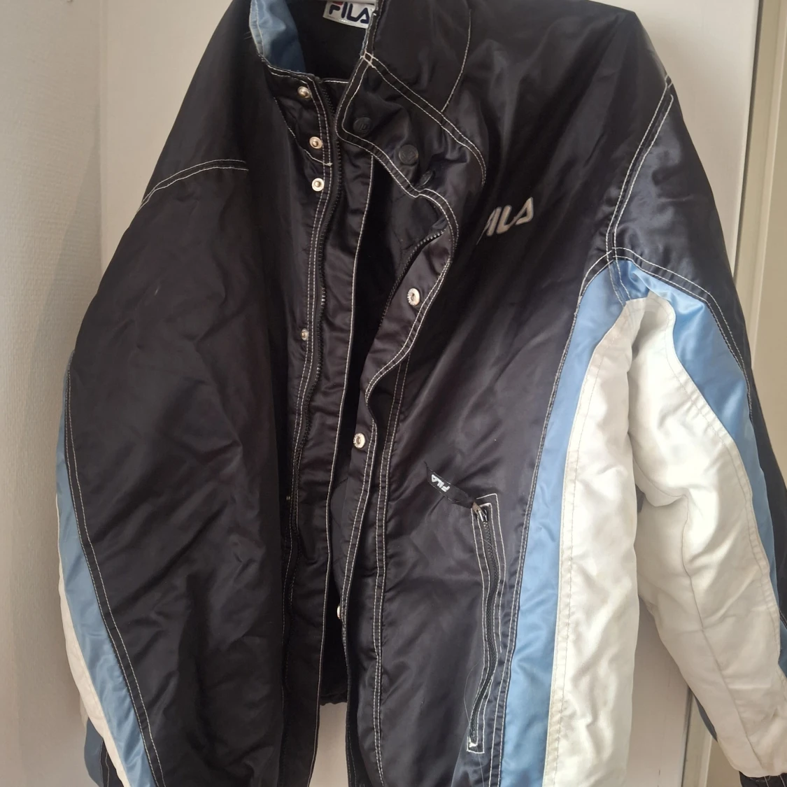 Säljer en fet pufferjacka från FILA i svart med vita och ljusblå detaljer. Jackan har dragkedja, tryckknappar och stora loggor både fram och bak. Perfekt för dig som vill sticka ut med en sportig vibe och hålla dig varm under kalla dagar.