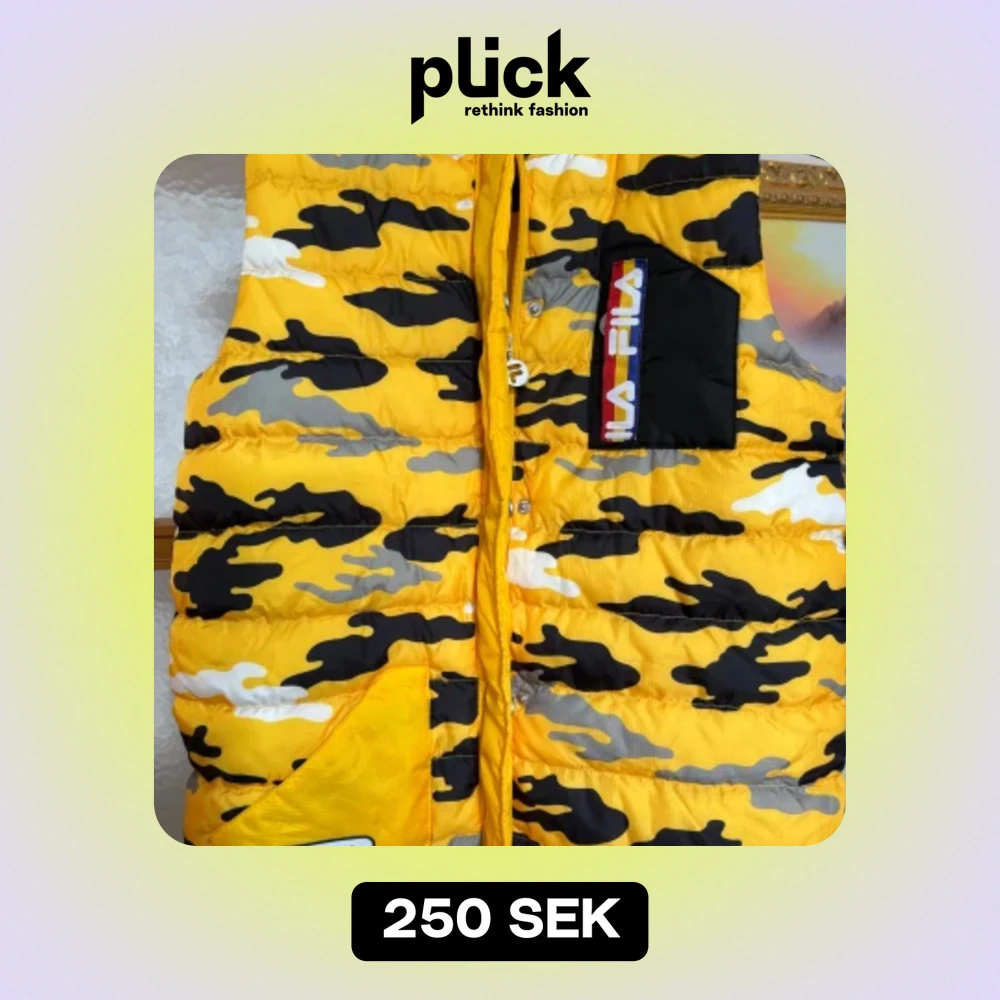 Säljer en supercool gul kamouflagemönstrad dunväst från FILA. Västen har en dragkedja framtill och en praktisk ficka med FILA-logga på bröstet. Perfekt för höst och vår när du vill sticka ut lite extra. Den är i nyskick och redo för nya äventyr!