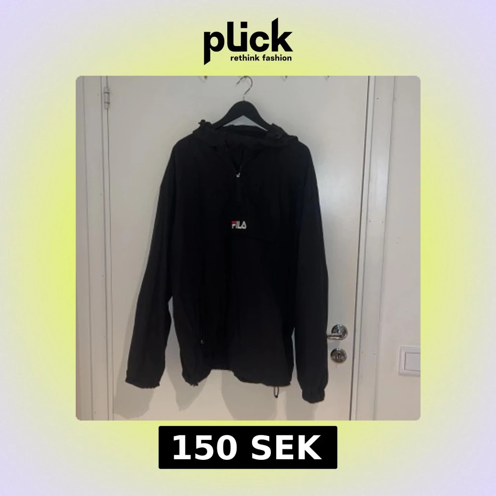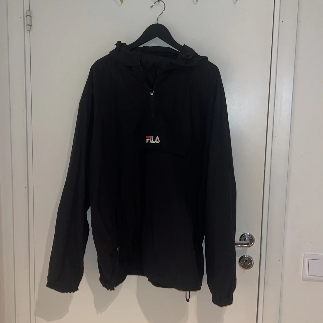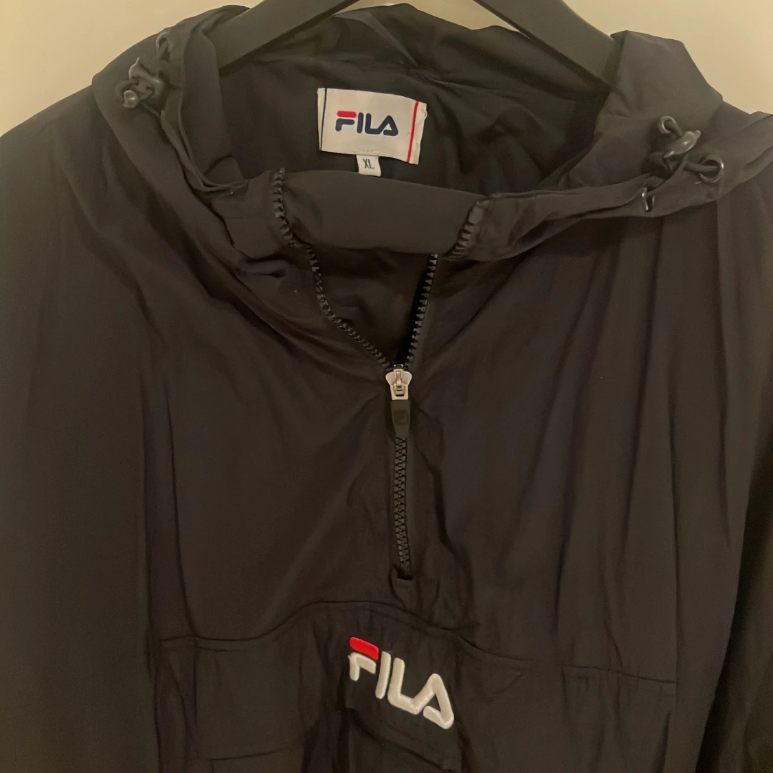 Säljer en svart vindjacka från FILA med dragkedja och huva. Jackan har en broderad logotyp på bröstet och är perfekt för blåsiga dagar. Den har långa ärmar och en praktisk ficka framtill.