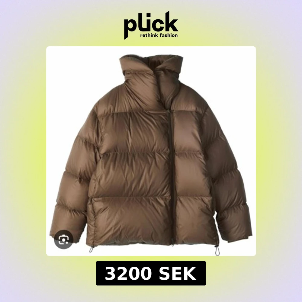 Säljer en mörkbrun pufferjacka med hög krage och dragkedja. Jackan har en oversized look och är perfekt för kalla dagar. Den är vadderad och har långa ärmar för extra värme.