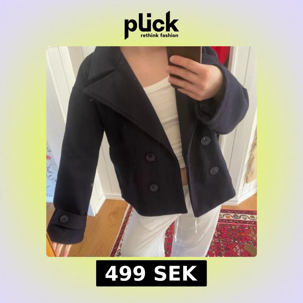 Säljer en stilren marinblå kappa med dubbelknäppning och bred krage. Jackan har långa ärmar och en klassisk design som passar perfekt för kyligare dagar. Perfekt för dig som vill ha en tidlös look. Obs ej fläckar det är spegeln!!