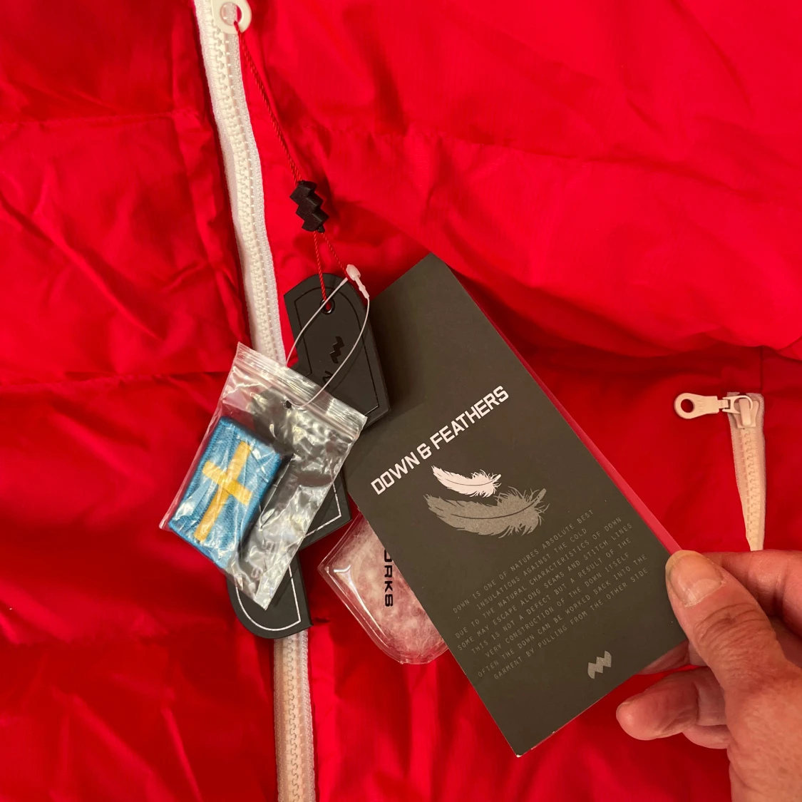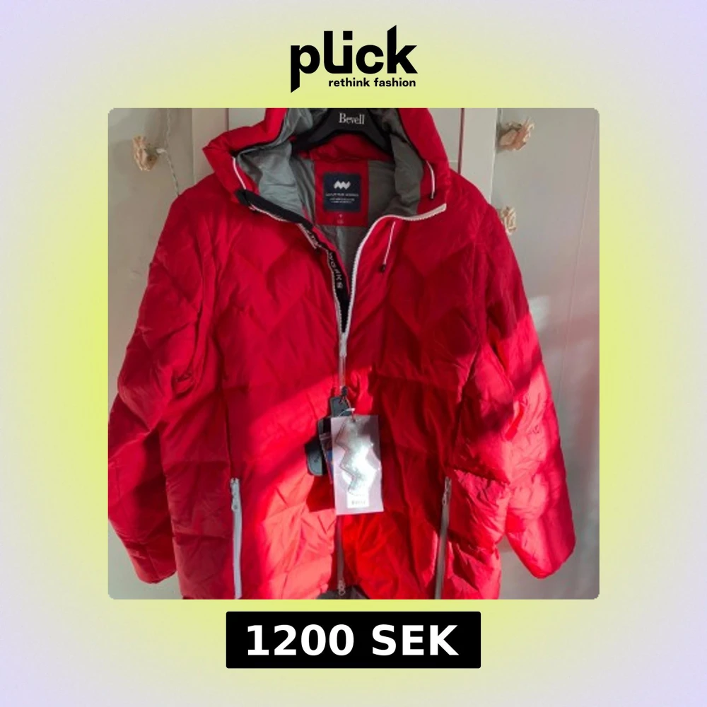 Riktigt fet röd dunjacka från Mountain Works, Sport Hybrid Collection. Jackan har huva, vita dragkedjor, quiltad design och coolt brittiskt flaggmärke på ärmen. Fylld med dun och fjädrar för max värme. Perfekt för kalla dagar och har en loose passform. Armarna är avtagbara