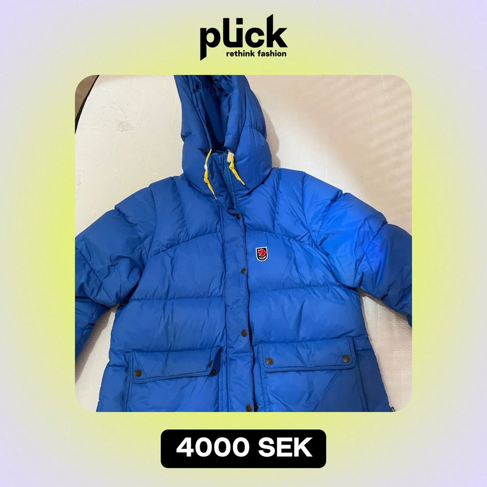 Snygg blå dunjacka från Fjällräven med huva och gula detaljer. Jackan har en klassisk design med knappar och dragkedja framtill samt praktiska fickor. Perfekt för kyliga dagar. Storlek M
