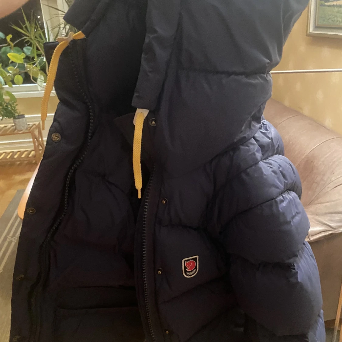 Säljer en mörkblå dunjacka från Fjällräven med två stora bröstfickor, dragkedja och tryckknappar. Jackan har huva med gula snören och klassisk Fjällräven-logga på bröstet. Perfekt för kalla dagar och riktigt snygg streetstil.