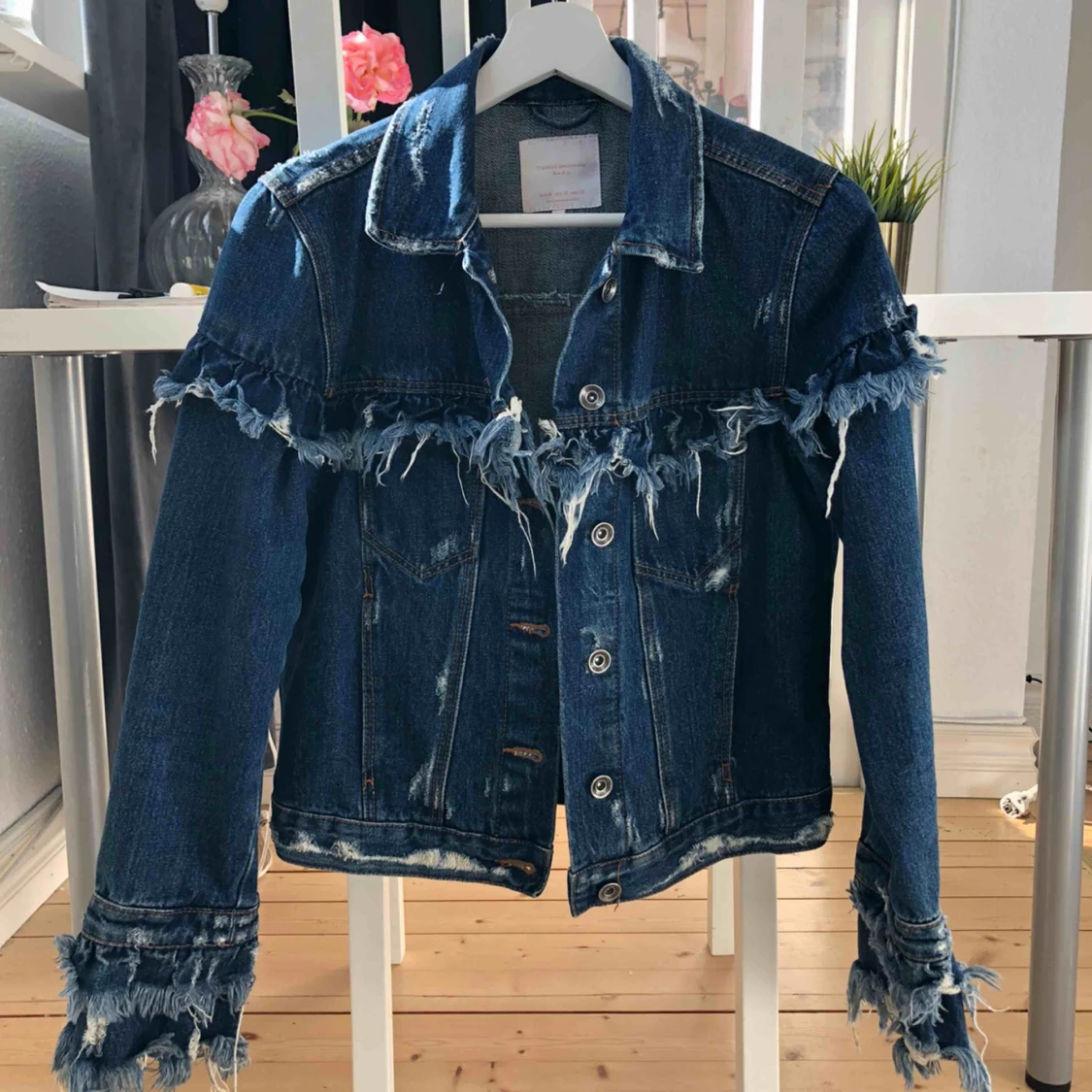 Jeansjacka med fransar från Zara!💙Säljer pga köpt för några år sedan och har inte haft någon användning för den sen dess. Strl M men sitter mer som S. Exklusive frakt⚡️