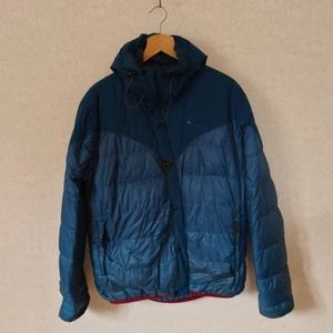 Blå dunjacka Klättermusen strl L. Ser lite "smutsig" ut (se bild 3) så fråga gärna efter fler bilder om du är intresserad! Väldigt varm och skönt!