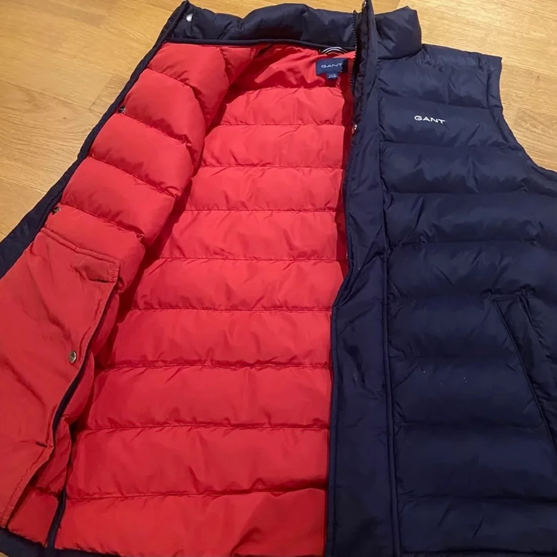 Mörkblå gant väst med röd insida, finns 2 fickor på insidan och 2 på utsidan. Nyskick, aldrig använd.