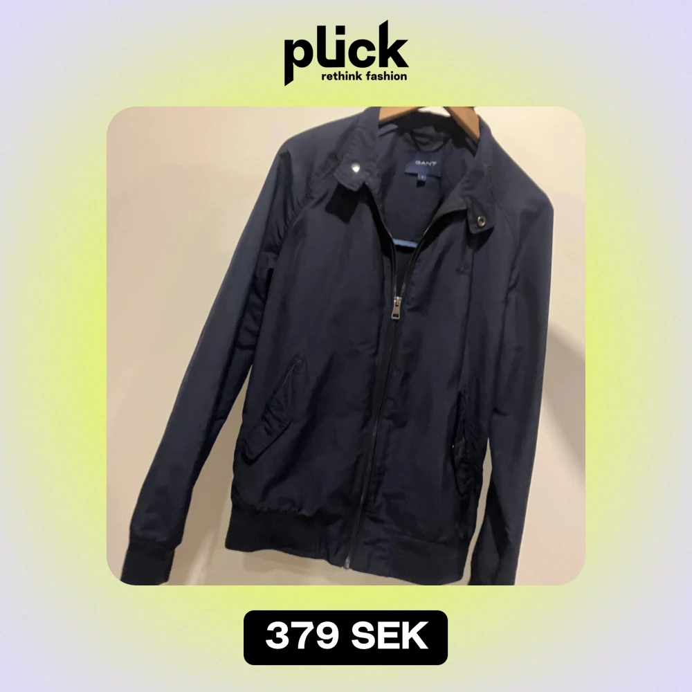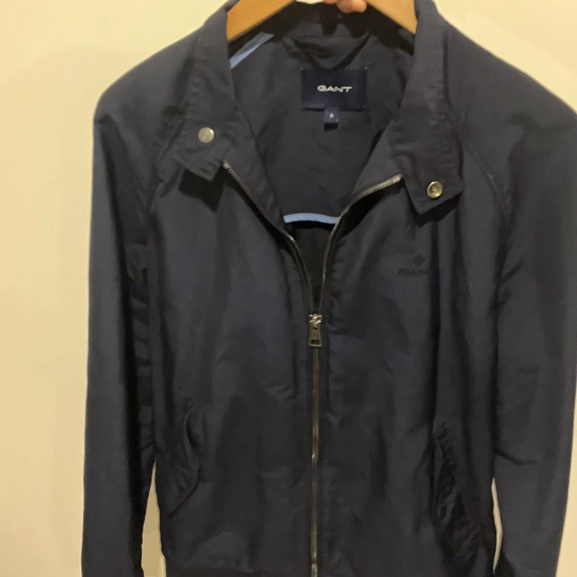 Säljer en stilren mörkblå jacka från GANT i mycket bra skick. Jackan har en dragkedja framtill och knappar vid kragen. Perfekt för höst och vår med sin klassiska design och bekväma passform.