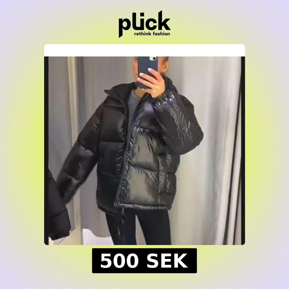 Snygg svart pufferjacka med glansigt utseende. Jätte varm och skön, skön luva på☺️storlek xs men passar även S