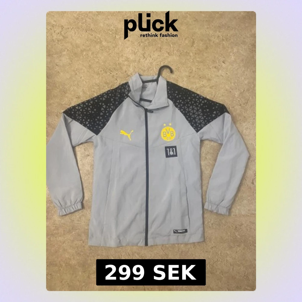 Snygg grå vindjacka från Puma med Borussia Dortmund-logga i gult på bröstet och svarta axelpartier med geometriskt mönster. Jackan har hel dragkedja, elastiska muddar och lång ärm. Perfekt för dig som gillar fotboll och sportig stil.