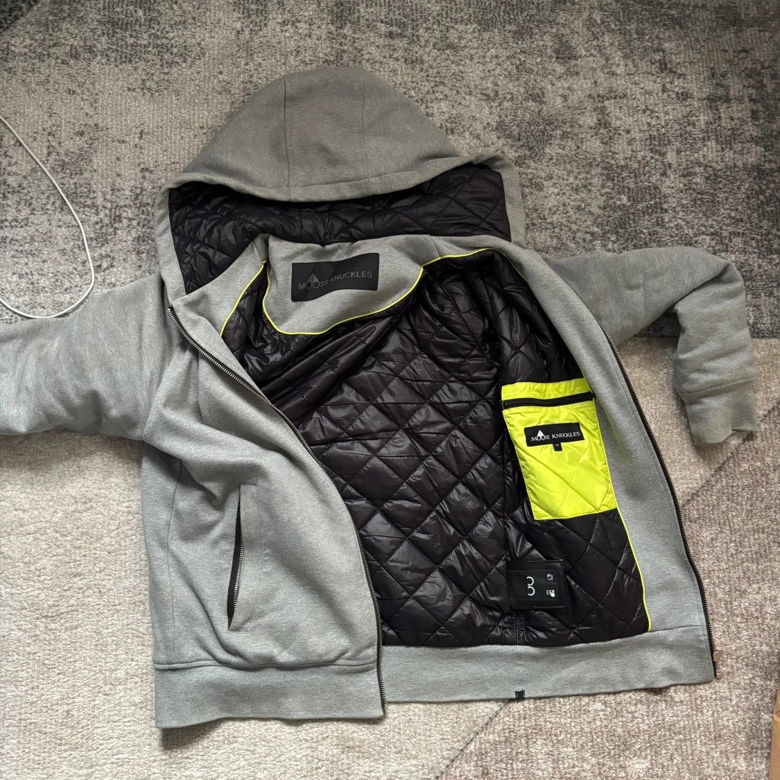 Snygg grå jacka från Moose Knuckles med svart logga på ryggen och metallogo på ärmen. Fodrad med quiltat svart innerfoder och gul detaljficka. Dragkedja framtill, två fickor och huva med snörning. Perfekt för kyliga dagar.