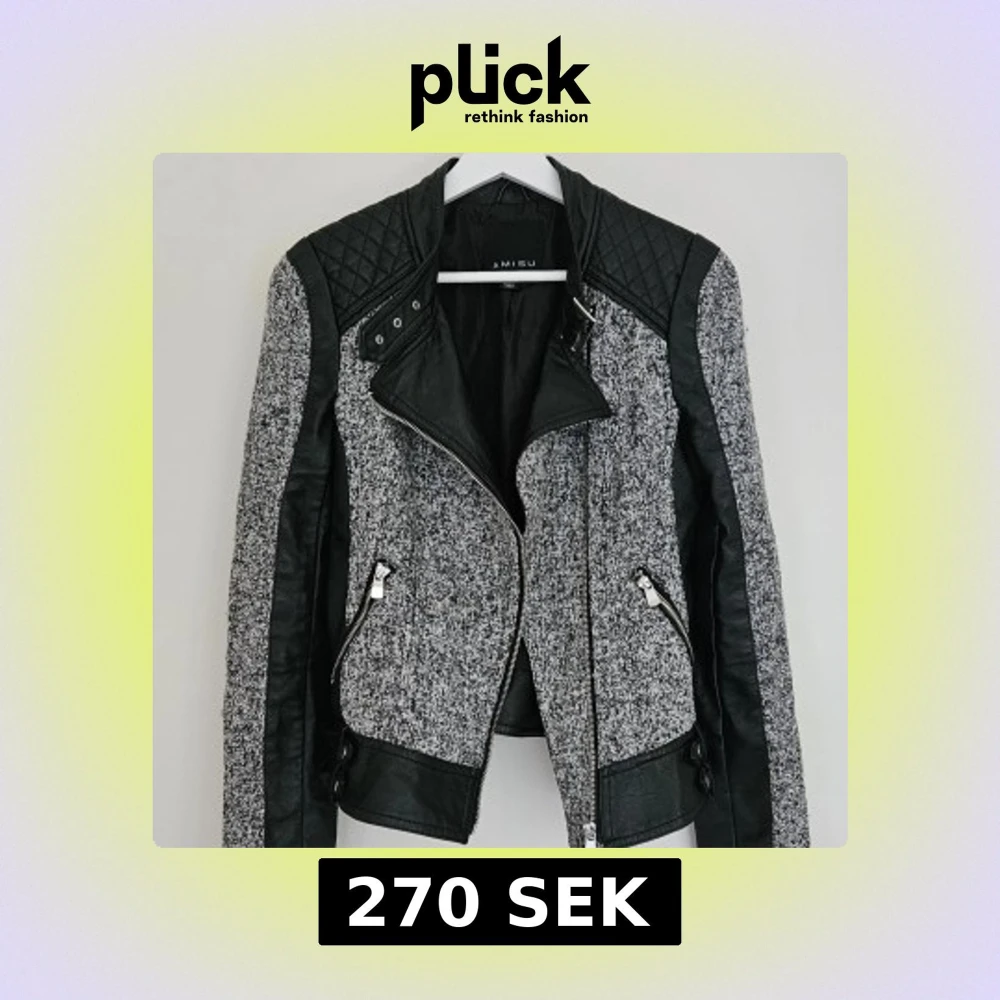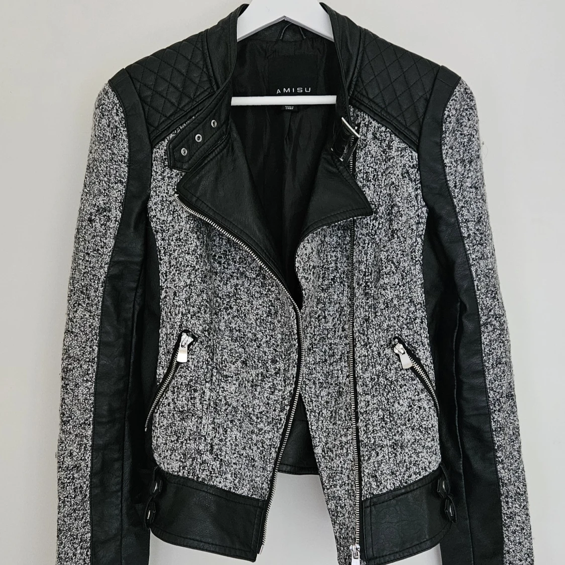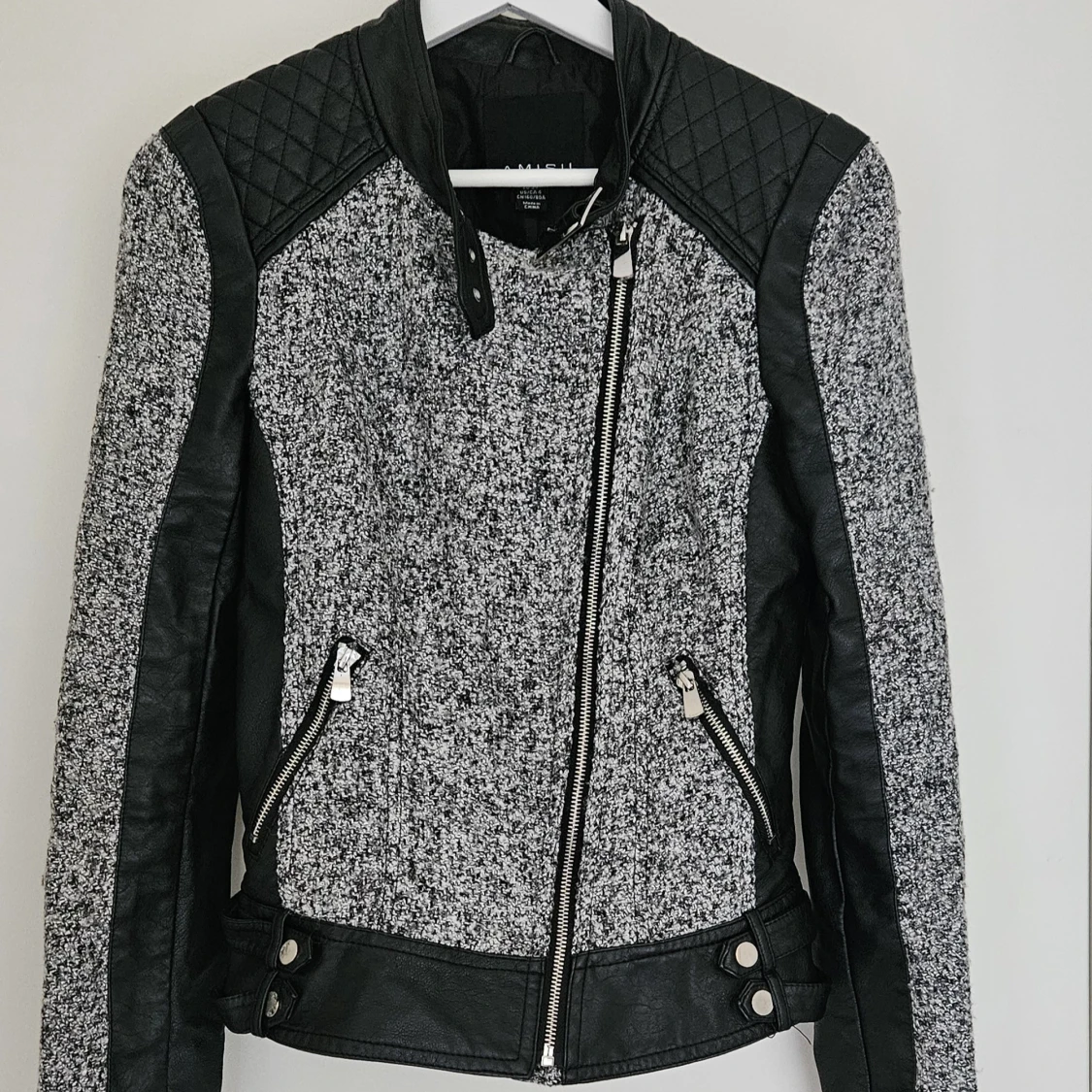 Bikerinspirerad jacka i gråmelerat tweed och svart skinnimitation. Quiltade axlar, asymmetrisk dragkedja, samt snygga detaljer med spännen i sidan. Strl 34, använd få gånger. Mycket fint skick!