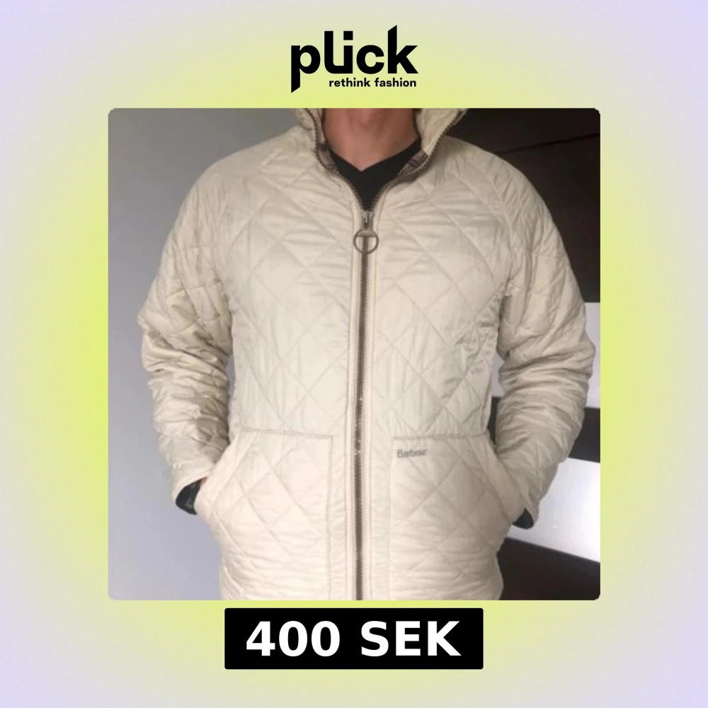 Quiltad beige jacka från Barbour med hög krage, två stora fickor framtill. Jackan har ett klassiskt rutmönster och är perfekt för dig som gillar stilren och tidlös design. Perfekt inför hösten!