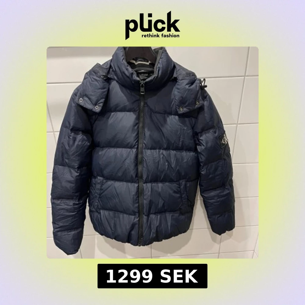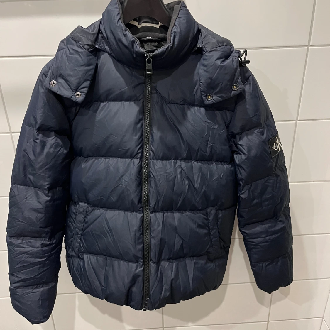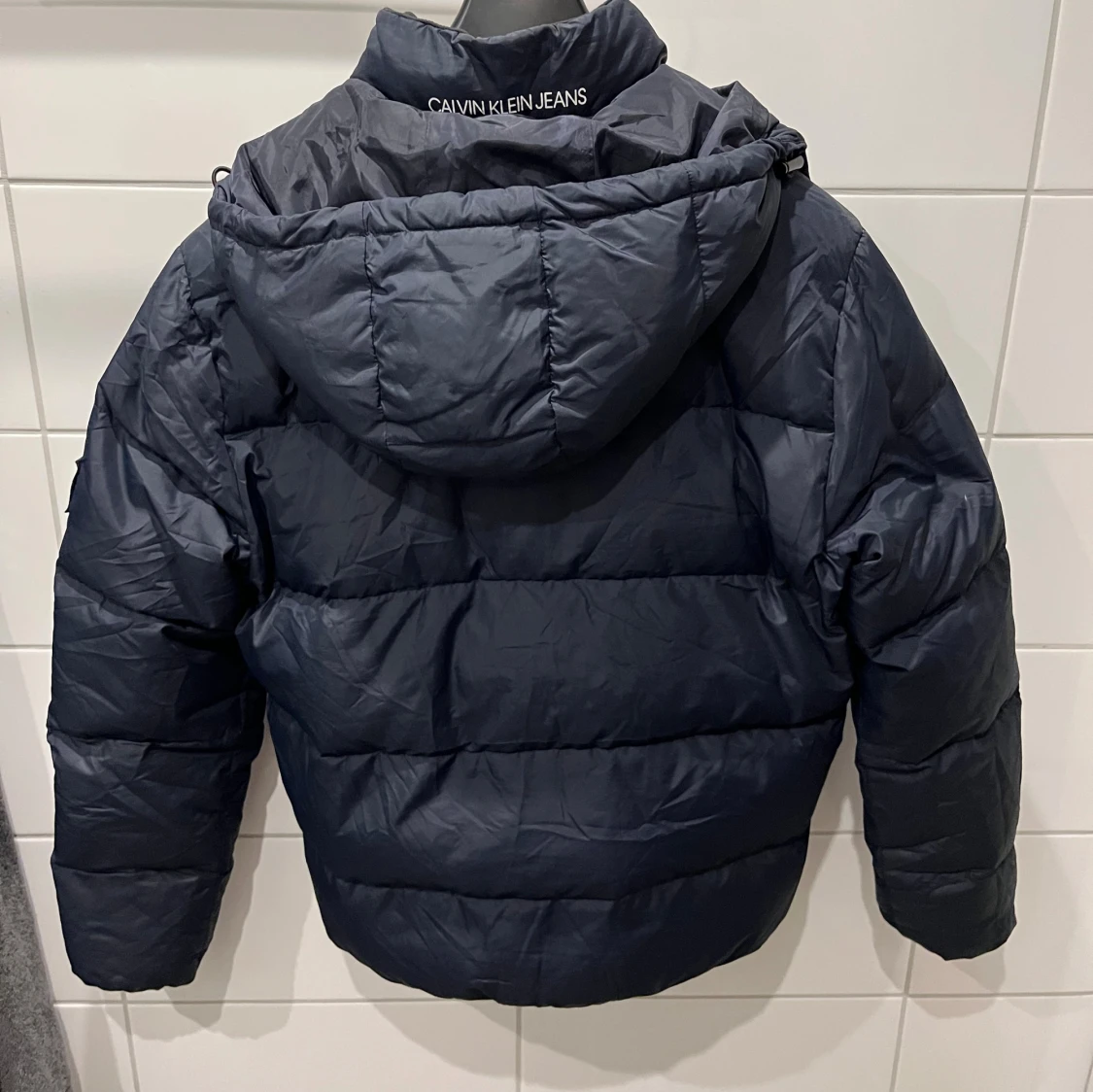 Säljer en mörkblå pufferjacka från Calvin Klein med huva och dragkedja framtill. Jackan har broderad logga på ärmen och tryckt logga i nacken. Perfekt för kalla dagar och har en riktigt schysst streetstil.