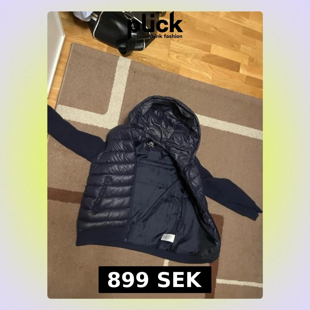 Säljer en mörkblå pufferjacka från Maggiore med huva och dragkedja. Jackan har quiltad framsida och rygg i nylon, samt stickade ärmar med Maggiore-logga på ena armen. Materialet är nylon och polyester, vilket gör den både lätt och varm. Perfekt för kyliga dagar!