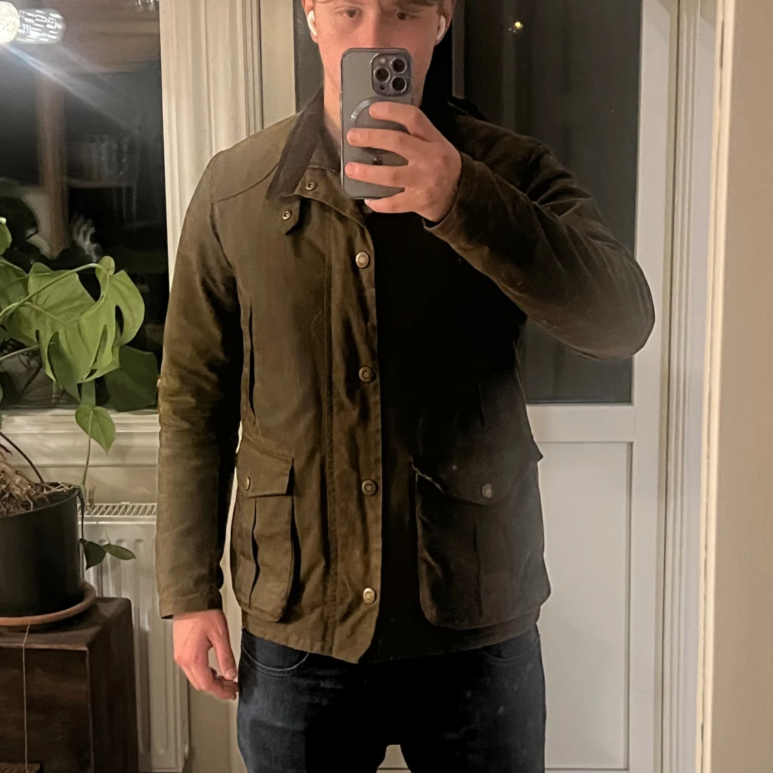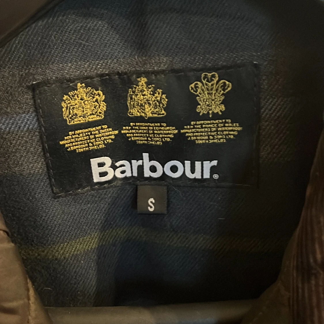 Säljer en klassisk olivgrön jacka från Barbour i storlek S. Jackan har bruna detaljer vid kragen, stora fickor framtill med knappar och quiltat innerfoder. Perfekt för dig som gillar tidlös brittisk stil och funktionella plagg.
