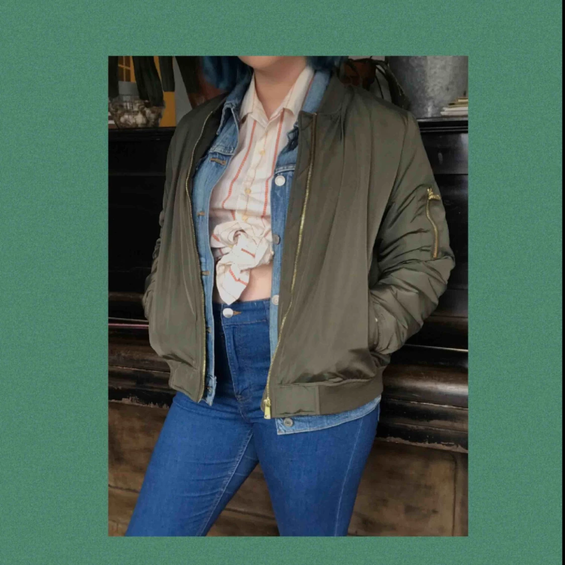En superskön olivgrön bomberjacka! Har haft den hela förra vintern och nu är det dags att säga hejdå:’( Sparsamt använd och är fodrad inuti! Frakten är redan inräknad i priset!!