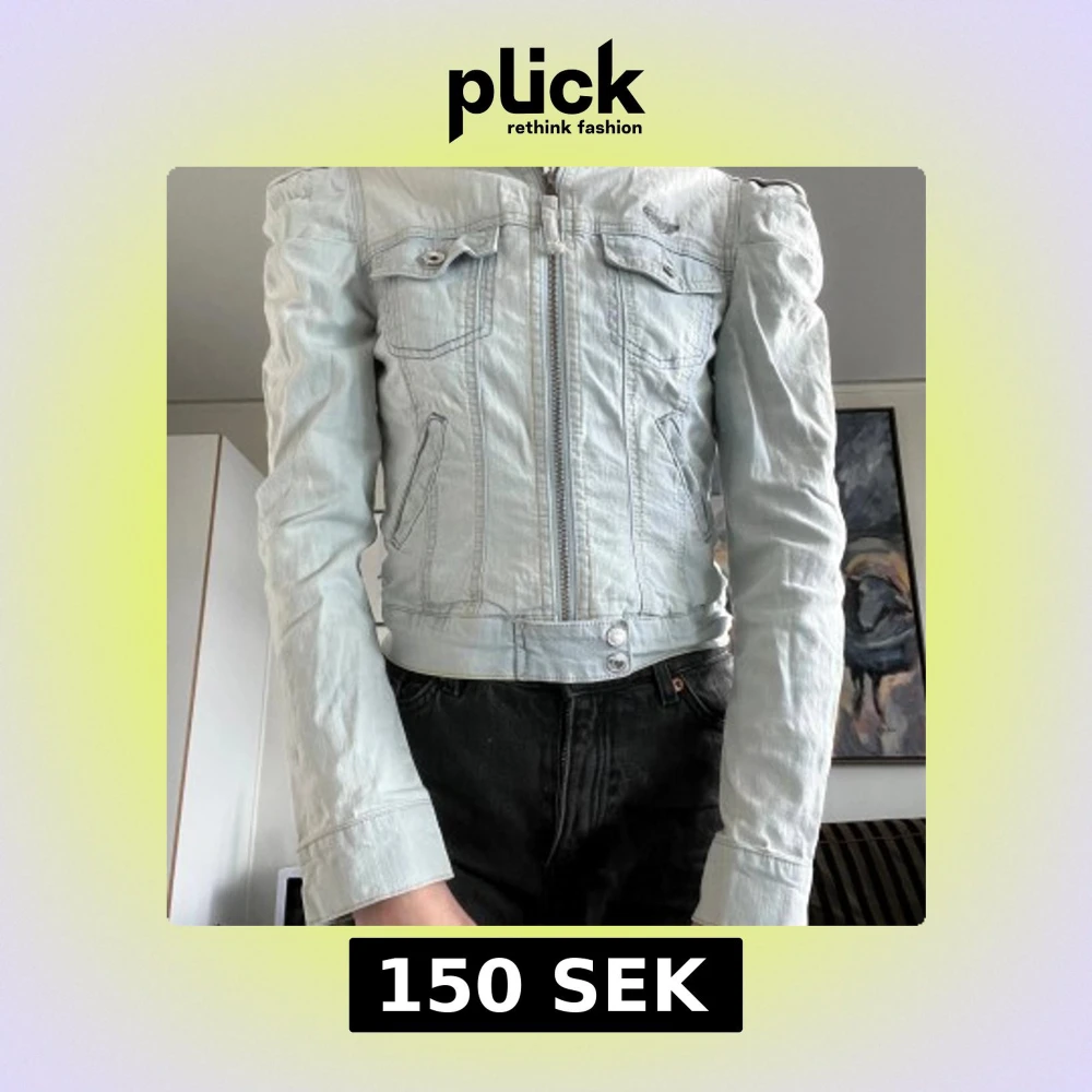 Säljer en ljusblå jeansjacka från Grunt Girl med markerade axlar och coola detaljer. Jackan har dragkedja framtill, två bröstfickor med lock och knappar samt två snedställda fickor. Croppad modell med lång ärm och snygg passform.