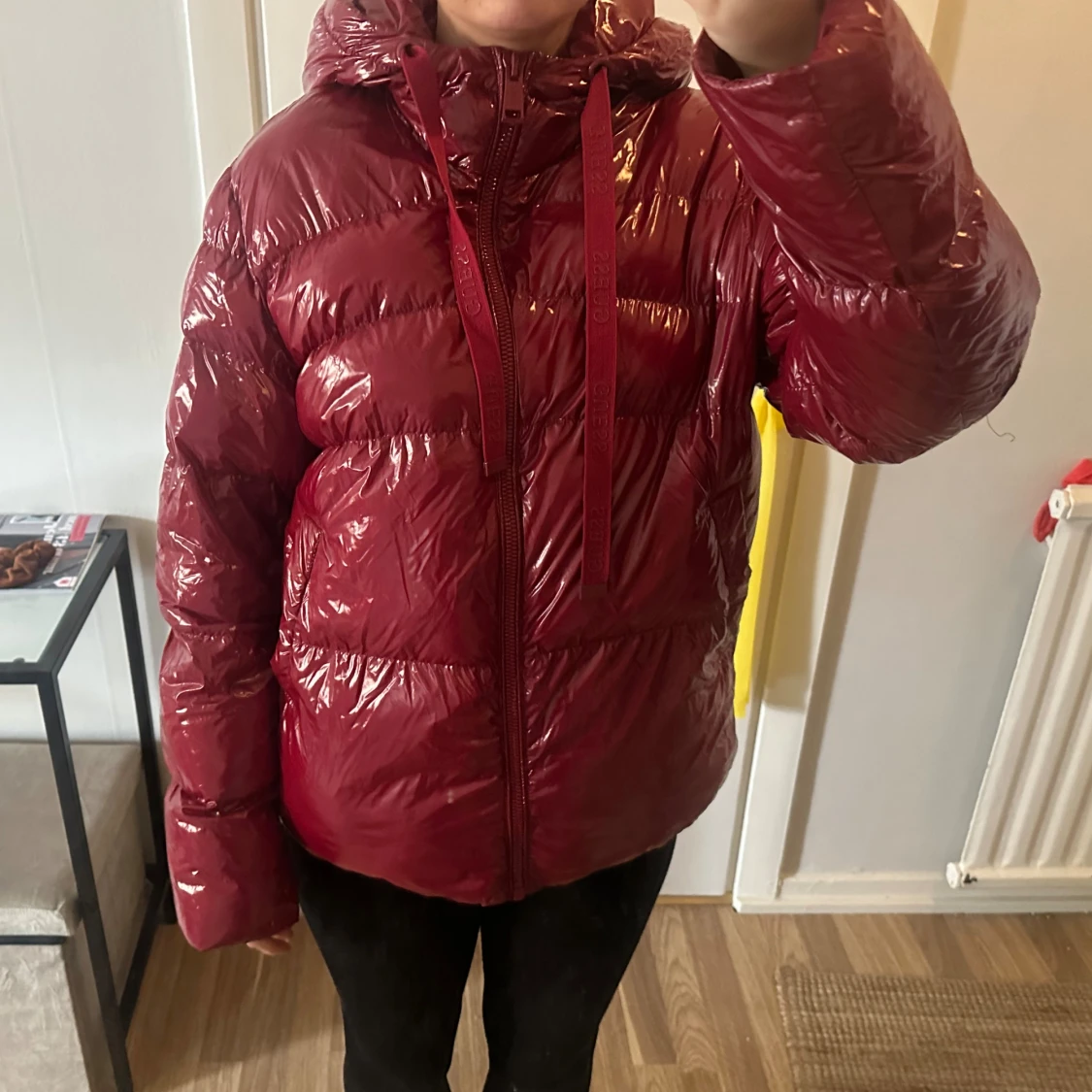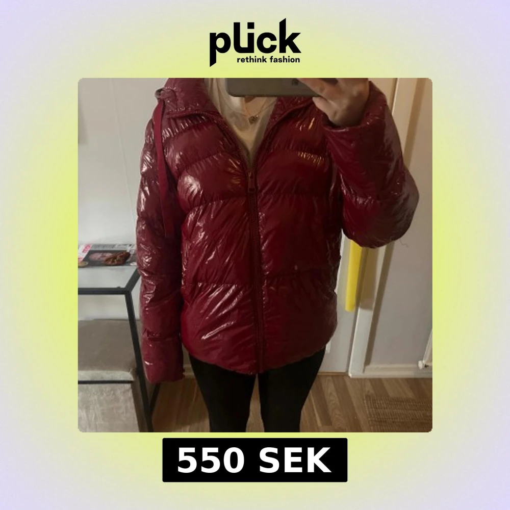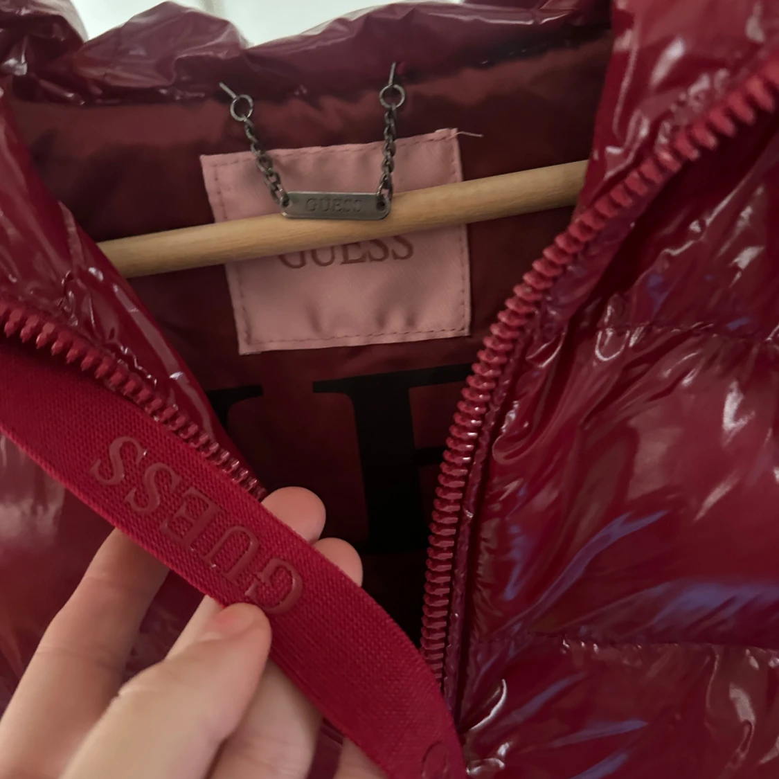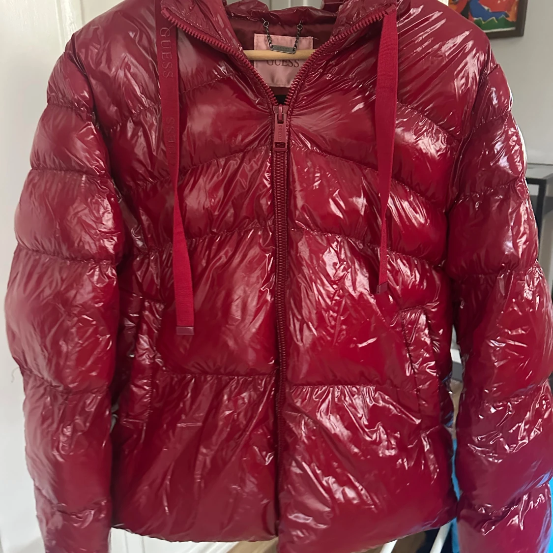 Säljer en glansig vinröd pufferjacka från Guess med huva och breda snören med logga. Du behöver denna coola jacka i ❄️. Bara använd några gånger! Hittar ingen storlek men för referens är jag 165cm lång och har vanligtvis Xs/S