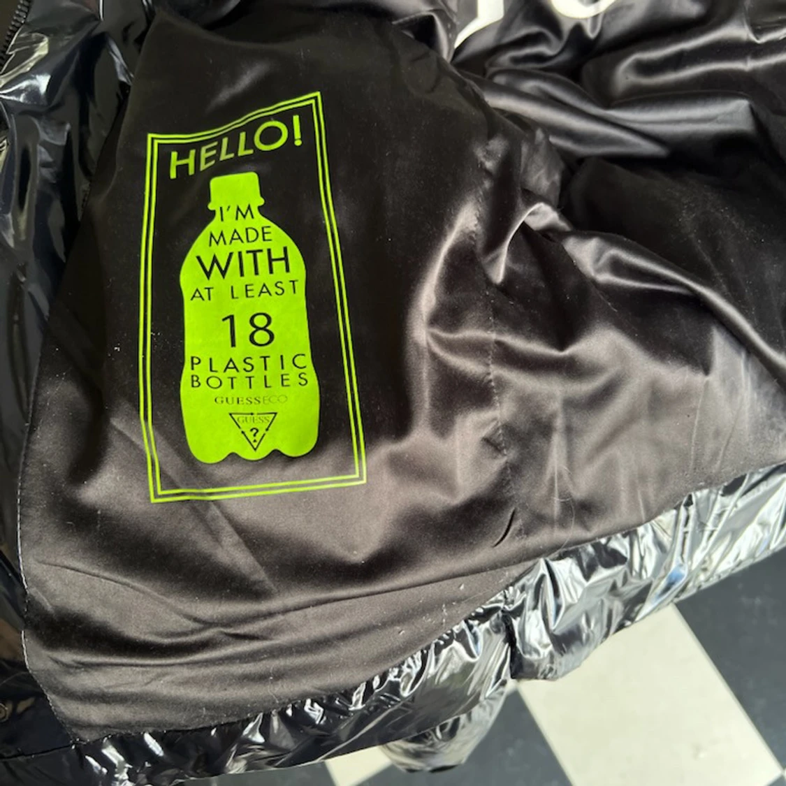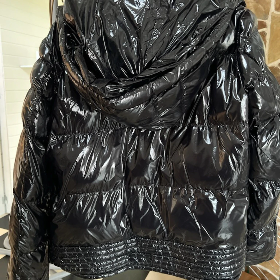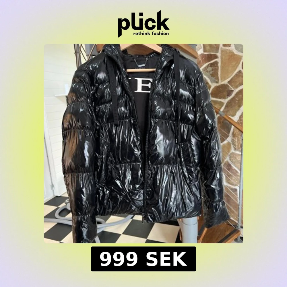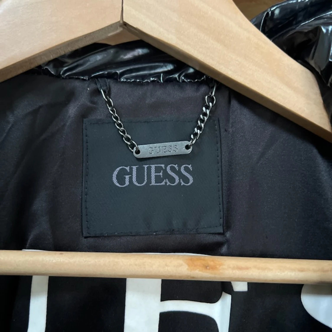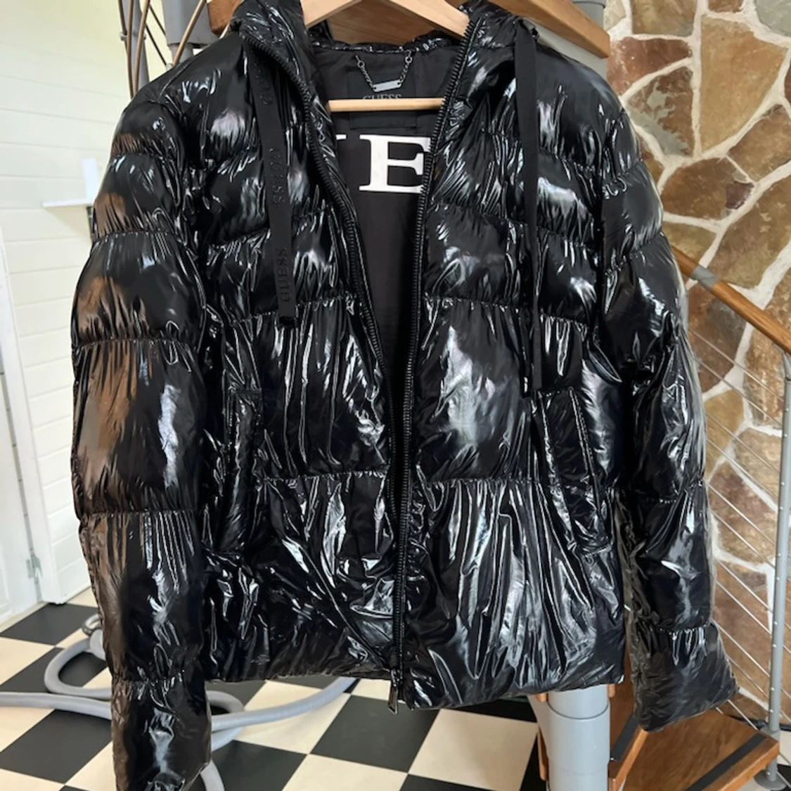 Snygg svart pufferjacka från Guess med glansig finish och huva. Ca använt 4 gånger . Den är vintage går ej att få dag på. Köpt för 2500kr Klicka ej på köp