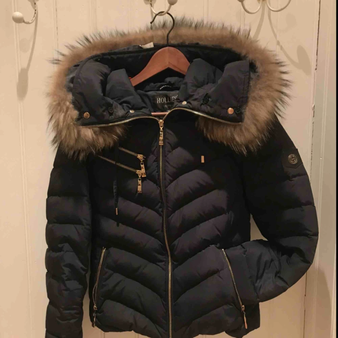 Knappt använd, figursydd passform, marinblå med gulddetaljer samt fluffig päls Kan gå ner i pris Går att hämta upp i Uppsala eller frakta emot fraktkostnad