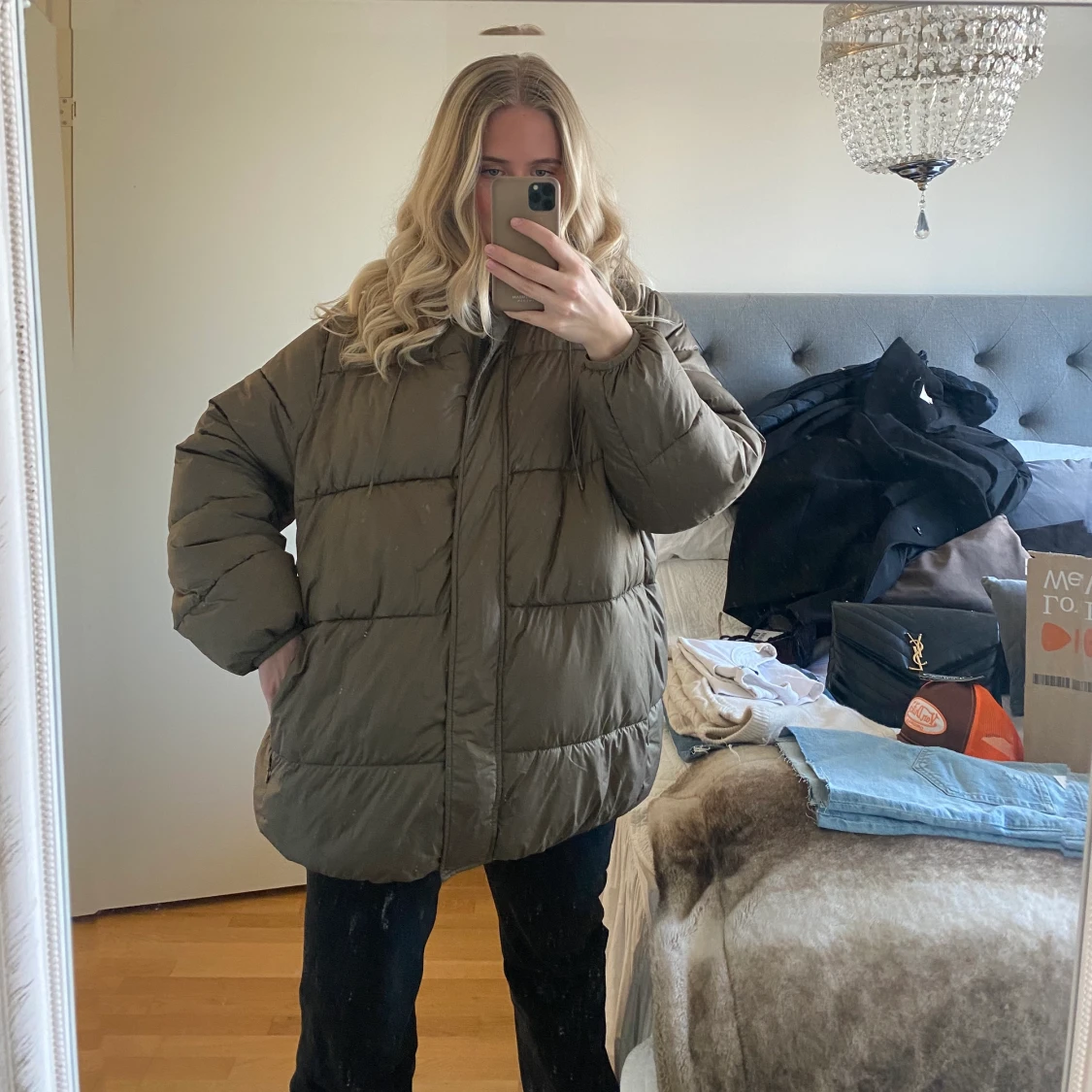 Snygg oversized dunjacka från H&M, dragkedjan är tyvärr sönder men funkar lika bra och knäppa den som jag gör ❤️