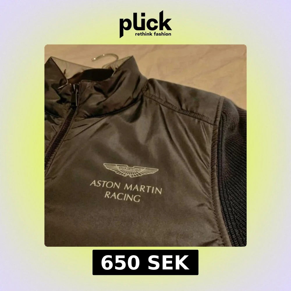 Superfin vårjacka från aston Martin och hacketts samarbete, marinblå utsida och silvergrå insida, stickat material på rygg och ärmar Storlek M