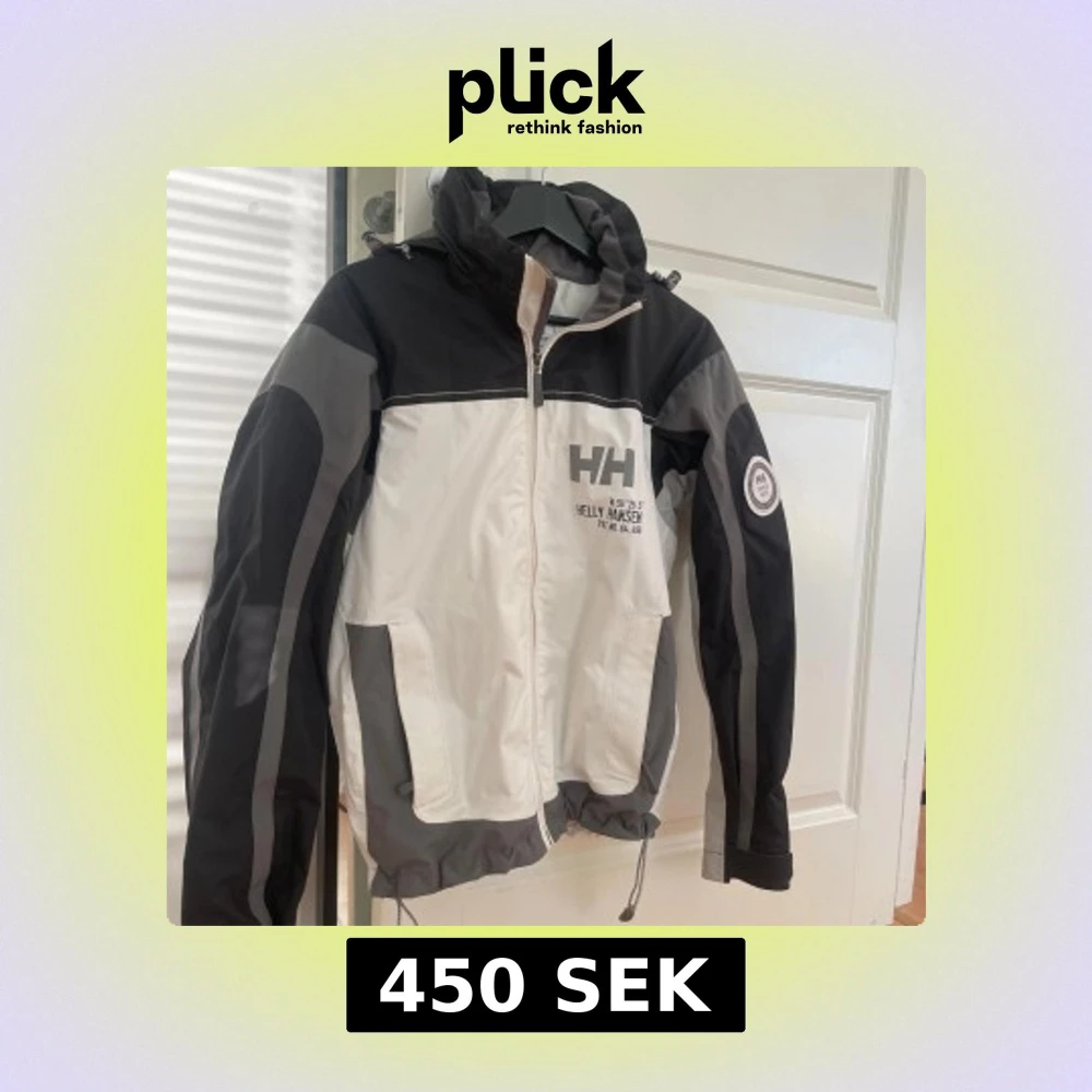 Säljer en stilren svart och vit vindjacka från Helly Hansen. Jackan har en dragkedja framtill och en justerbar huva. Den är dekorerad med Helly Hansen-logotypen på bröstet. Har en liten fläck på insidan men syns inte på utsidan. Tveka inte att höra av dig vid frågor 🙂