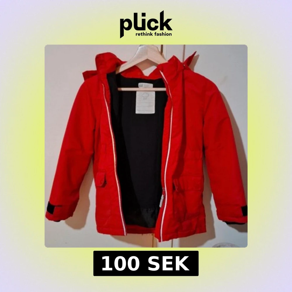 Röd vinterjacka från H&M med huva och avtagbar fuskpäls. Jackan har dragkedja framtill, fickor med lock och långa ärmar med svarta muddar. Perfekt för kalla dagar.