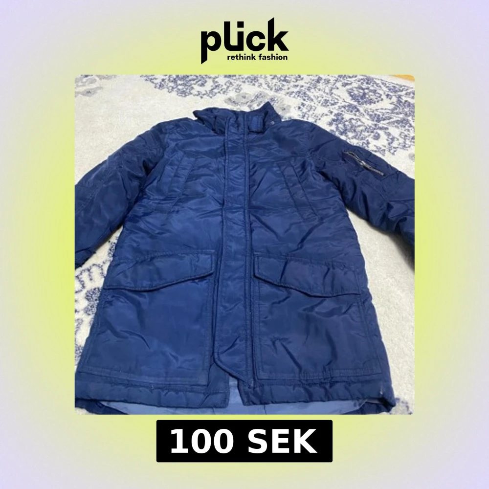 Snygg mörkblå pufferjacka från H&M med hög krage och stora fickor framtill. Jackan har dragkedja och tryckknappar, samt en extra ficka med dragkedja på ärmen. Perfekt för kalla dagar och enkel att matcha med det mesta.