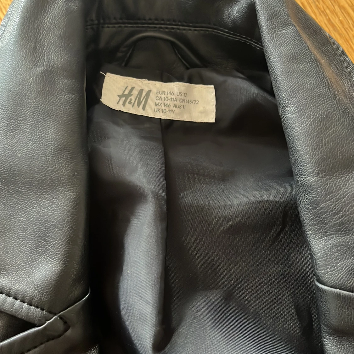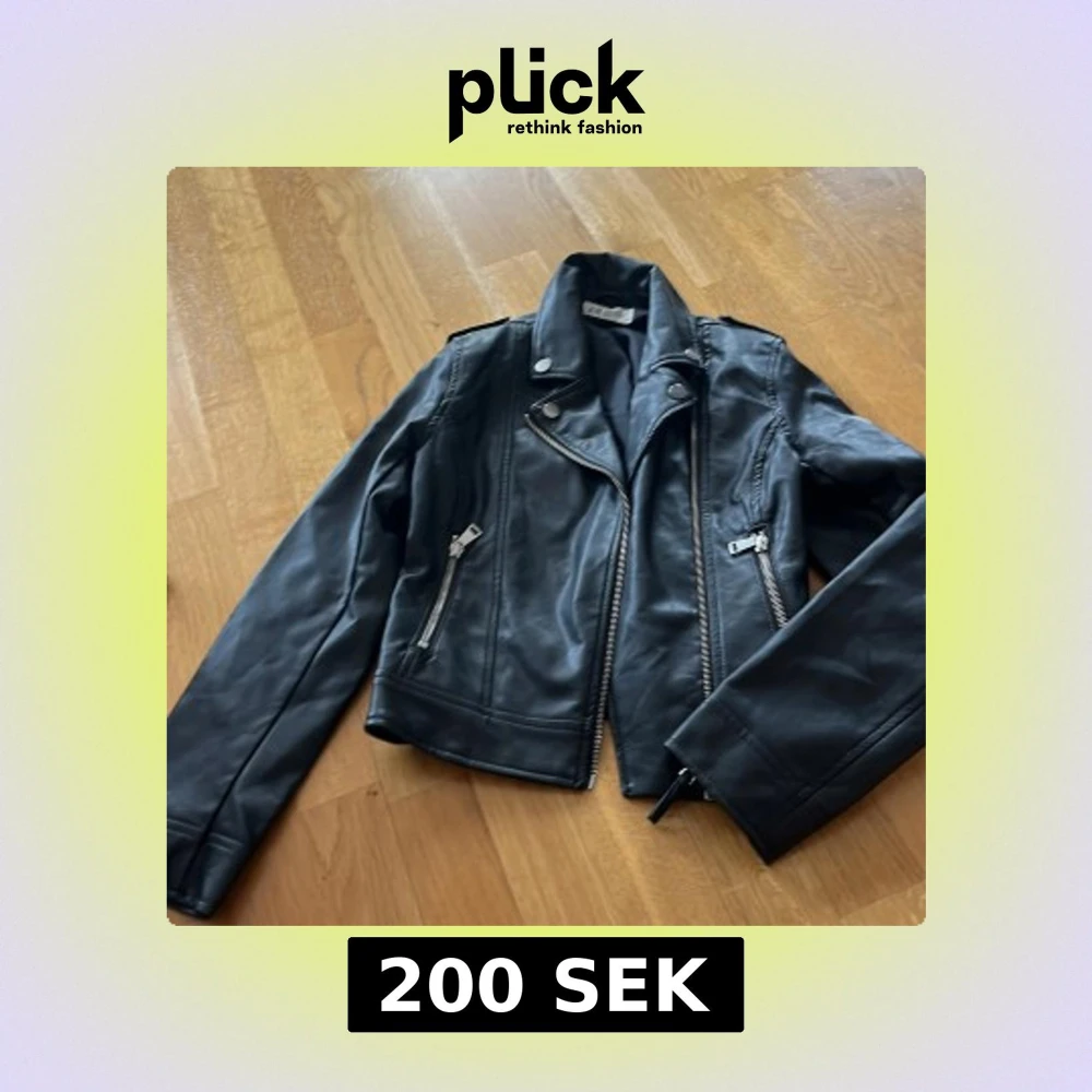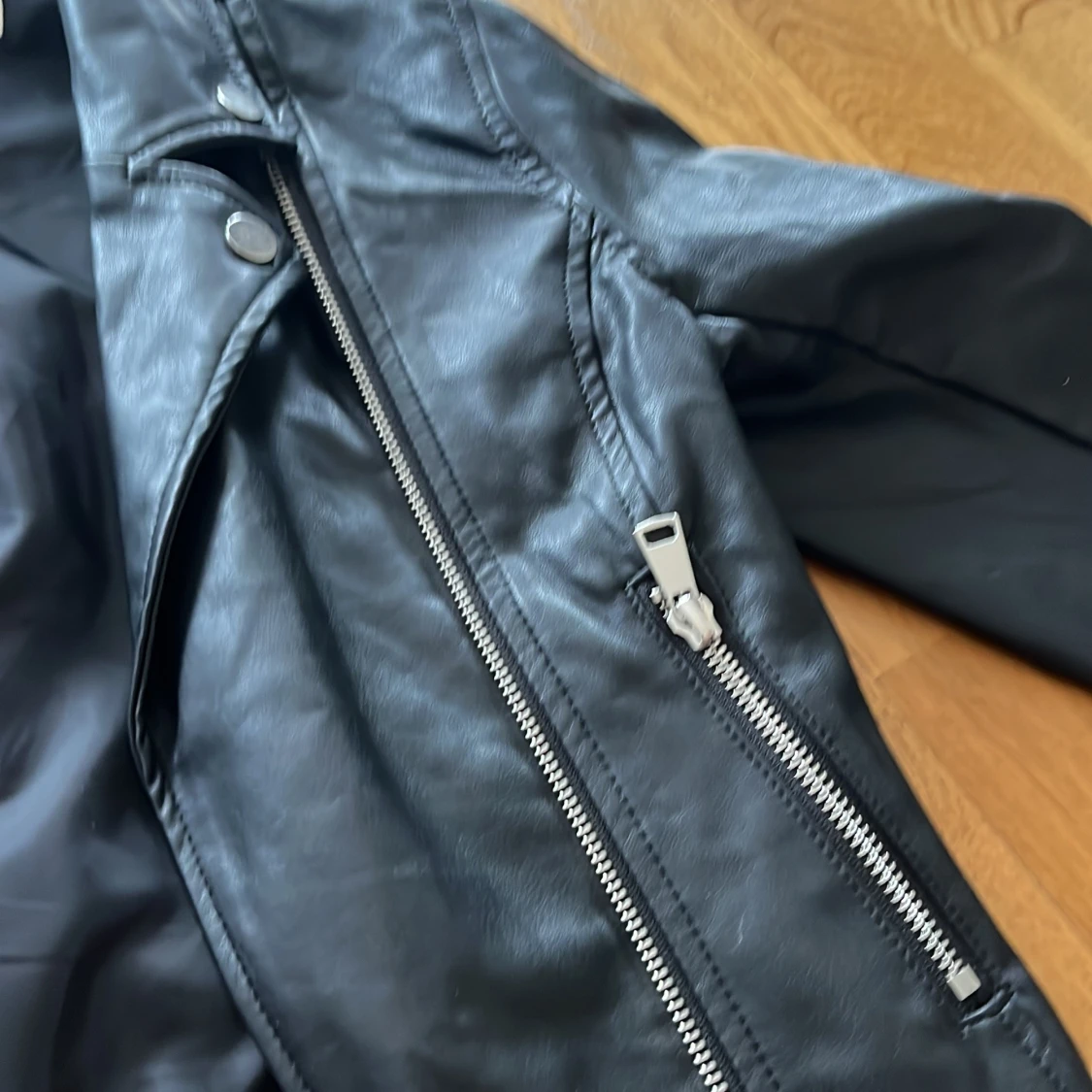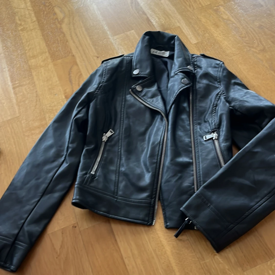 Säljer en svart jacka från H&M med silvriga dragkedjor och klassisk bikerstil. Jackan har långa ärmar, snedställd dragkedja framtill och två fickor med dragkedja. Perfekt för en cool och stilren look.Kort i längden. Liten ”repa” på ryggen som ej påverkar intryck