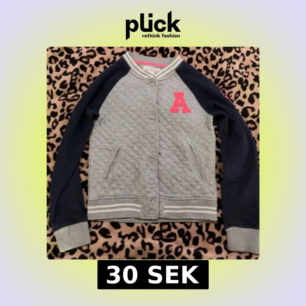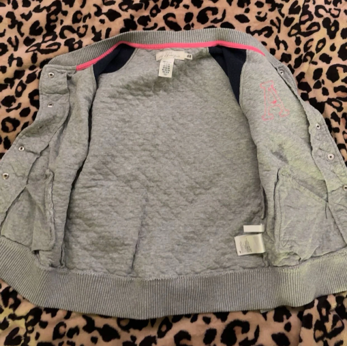 Tunn grå jacka med blåa armar från H&M och ribbade muddar. Stor rosa bokstav A på bröstet och tryckknappar framtill. Jackan har två fickor och sportig collegekänsla, perfekt för dig som gillar avslappnad stil.
